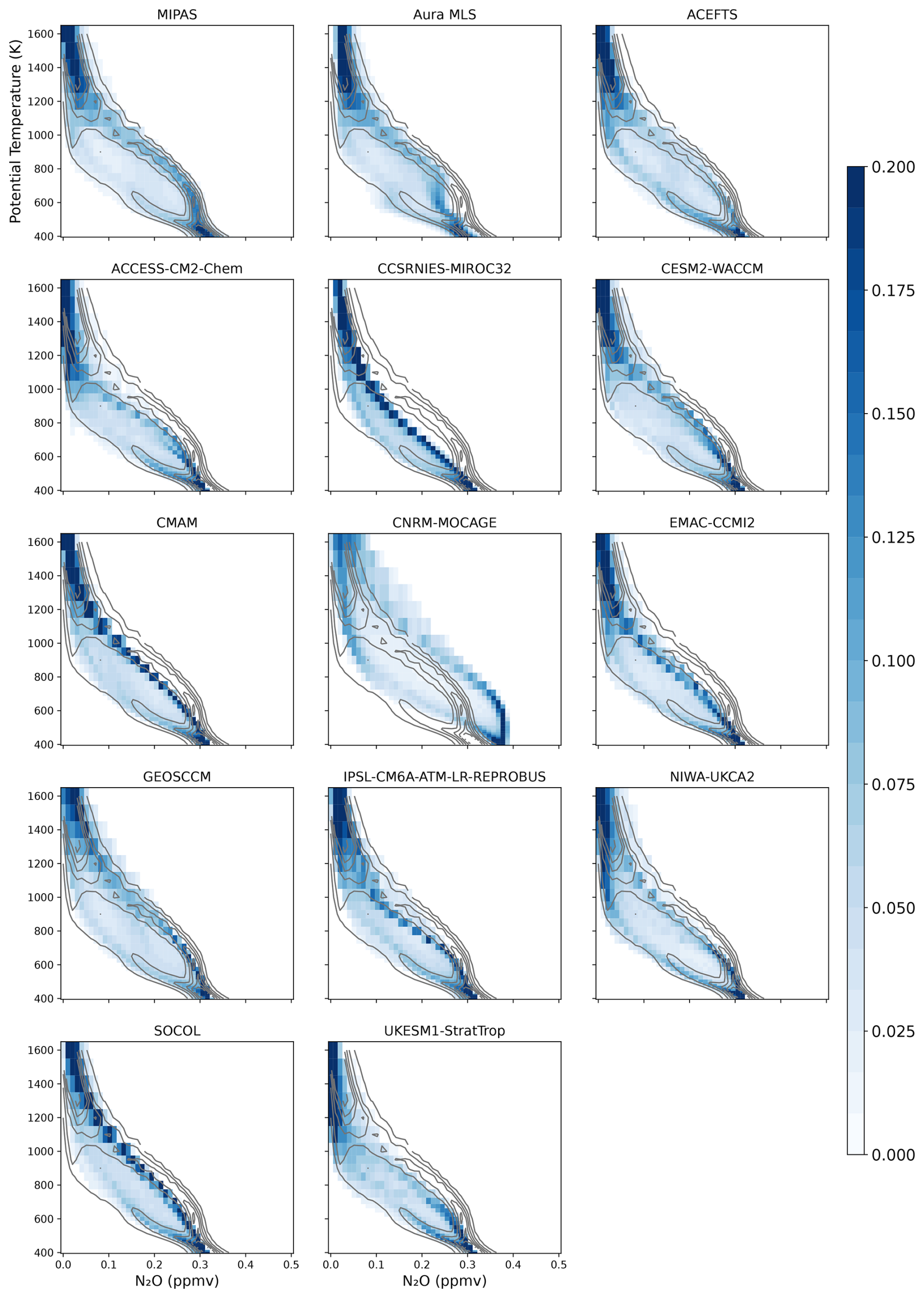 Figure 7PDFs for N2O satellite data from MIPAS, MLS, ACE-FTS (top panels), and monthly mean model data from CCMI-2022 models. 10° S–45° N, MAM season 2005–2012 period. The ACE-FTS PDF contours are shown in all panels to facilitate the comparison (gray contours). The tracer mixing ratios are binned in 100 bins in the range 0–0.5 ppmv, and the PDF is normalized such that the total frequency on each level adds up to 1.