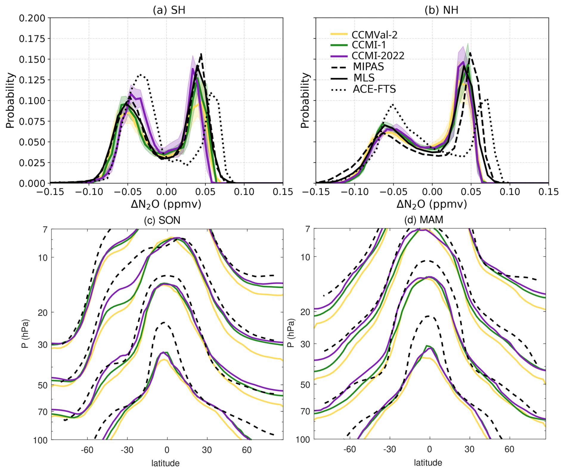 Figure 8(a–b) PDF profiles for MMMed for the three generations with observations at 600 K, 2005–2012. Each model's PDF is shifted so its mean mixing ratio aligns at zero. (c–d) Contours of N2O mixing ratio for the MMMed of the three generations and MIPAS (contour levels: 0.07, 0.014, 0.021 and 0.028 ppmv; values decrease with altitude). 1990–2010 mean for models and 2005–2012 mean for observations.