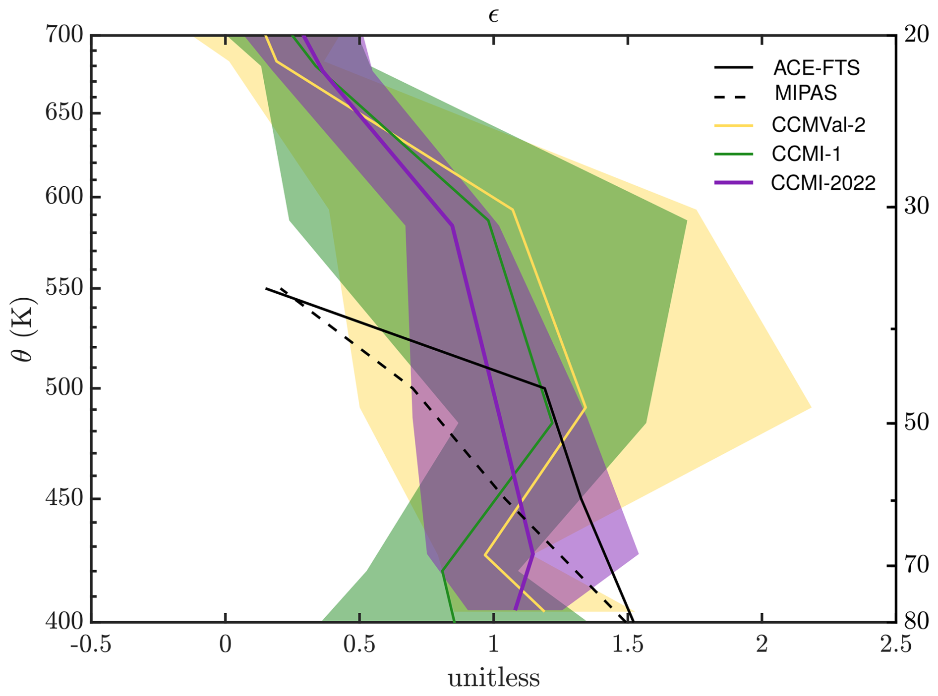 Figure 4Estimate of the mean meridional overturning mass flux from the meridional mean age gradient following Linz et al. (2016). Calculations shown for ACE sink-corrected, ACE uncorrected, and MIPAS data and for the multi-model median of the three generations of models, where the shading represents the median absolute deviation at each level. The second y-axis shows the CCMI-1 pressure for comparison with other metrics in this study.