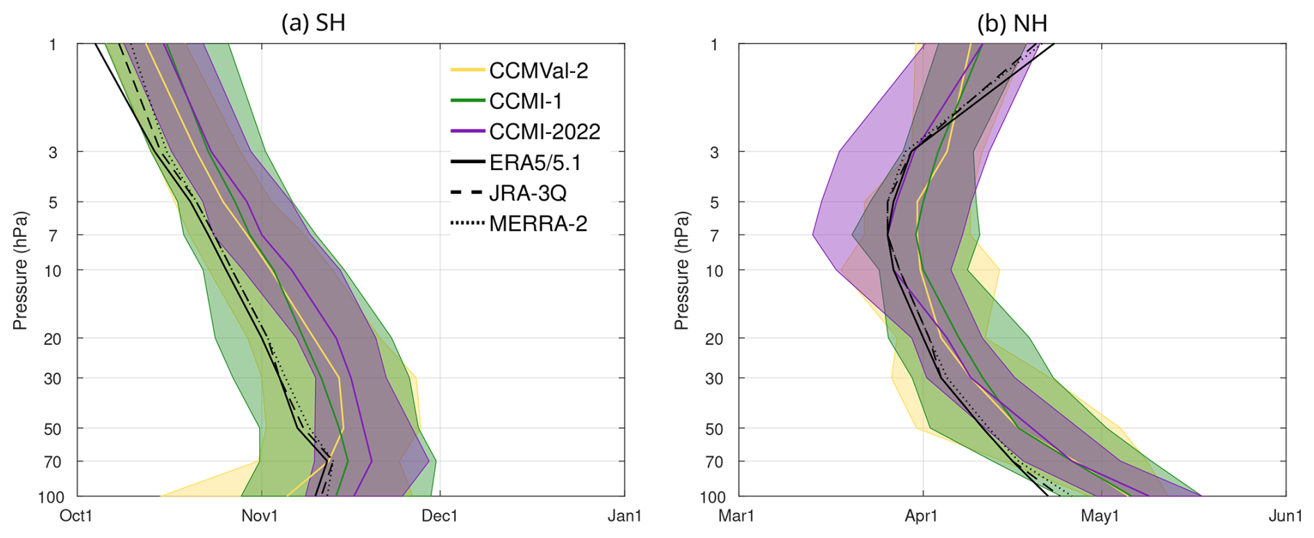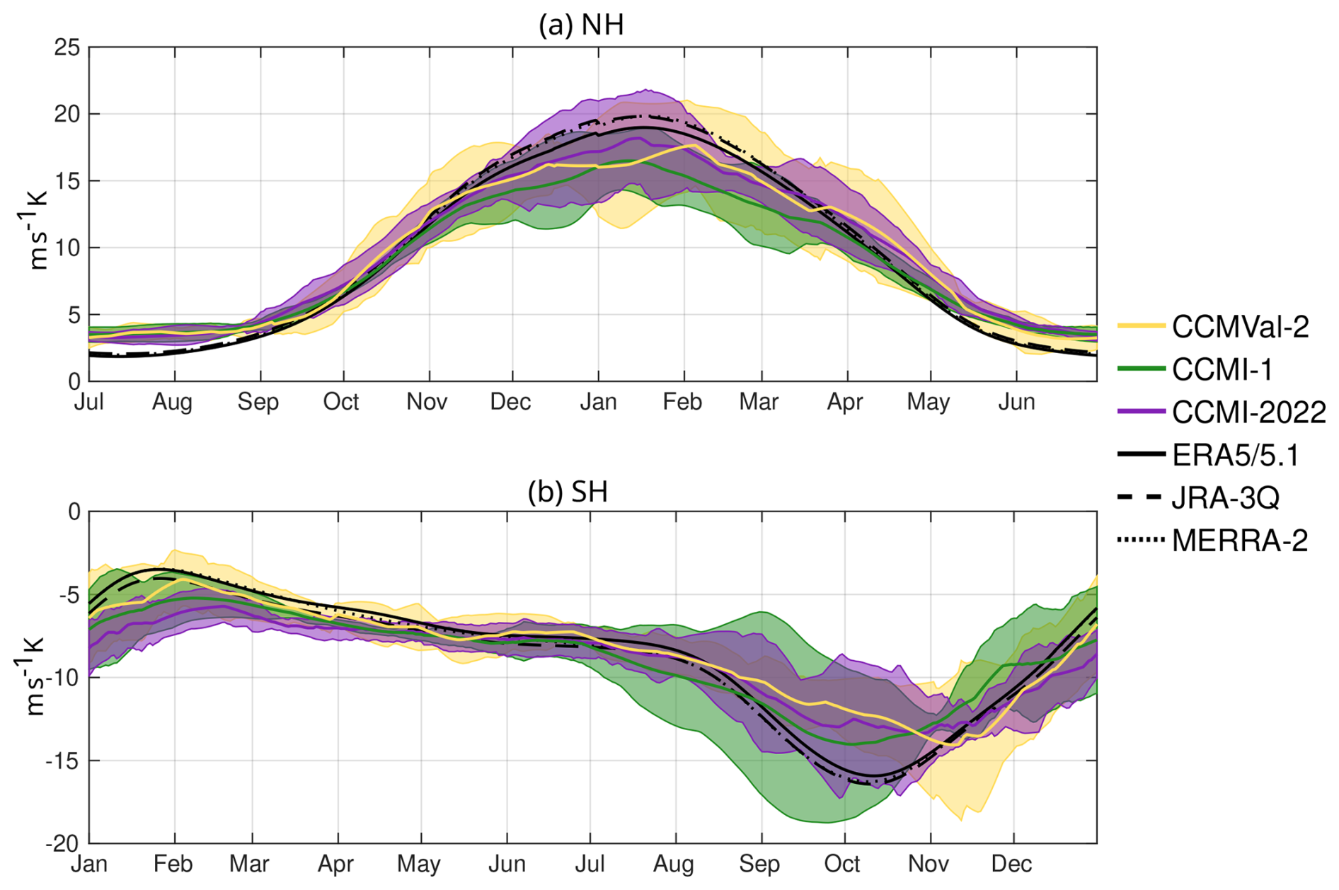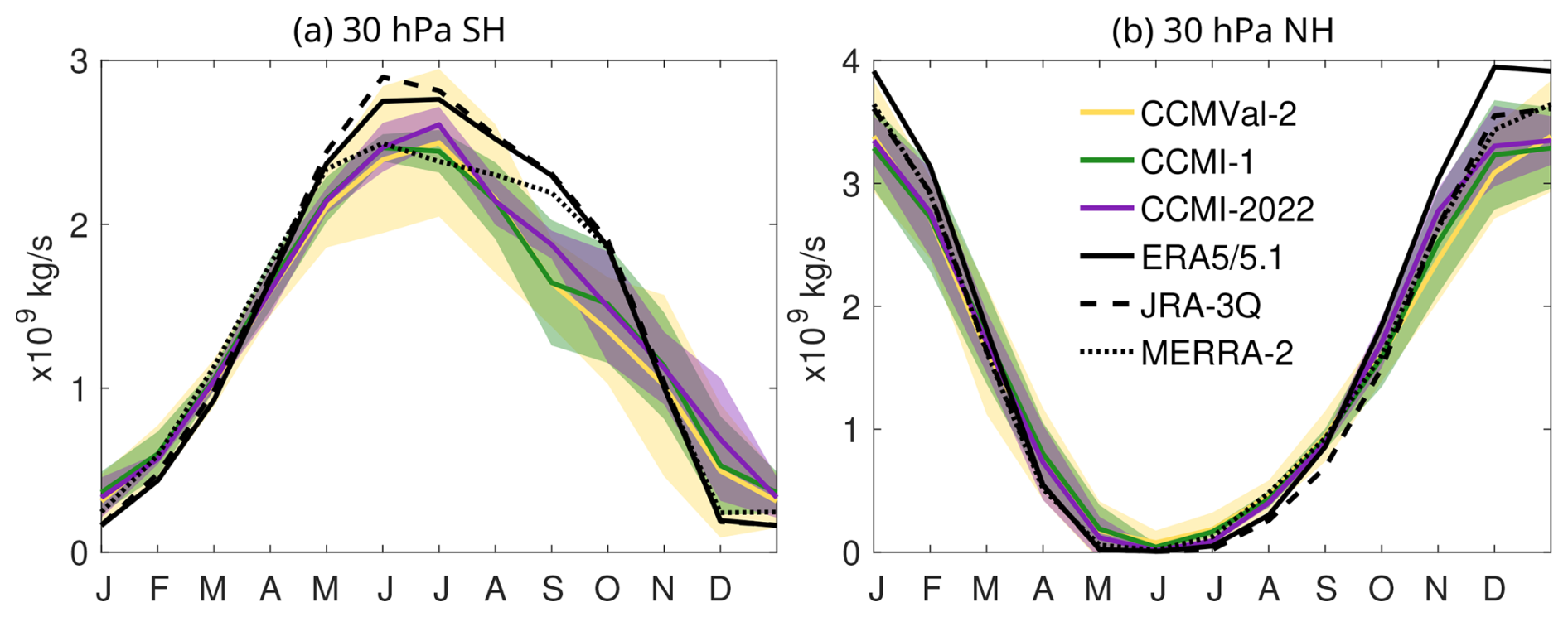 Figure 3b shows the seasonal cycle in the net upward mass flux in the lower stratosphere (70 hPa). The difference between ERA5/5.1 and the other reanalyses is concentrated in the boreal winter months (November to March), overall leading to a larger amplitude in ERA5/5.1's seasonal cycle. Across the three generations, the models MMMed show a larger seasonality (∼ 40 %) compared to MERRA-2 and JRA-3Q (∼ 30 %), although still smaller compared to ERA5 (∼ 50 %). The inter-model spread is largest throughout the year in the oldest generation (CCMVal-2), and notably reduced in the newest generation (CCMI-2022), although the MMMed is very similar to that from the previous generation (CCMI-1). As will be shown, the reduced spread is a common feature of the newest model generation found across several metrics (but not in all). At higher levels, the annual cycle is reduced (with the semi-annual variability becoming dominant, e.g., Abalos et al., 2021) and the agreement between model generations and reanalyses increases as the magnitude becomes smaller (Fig. S5 in the Supplement).