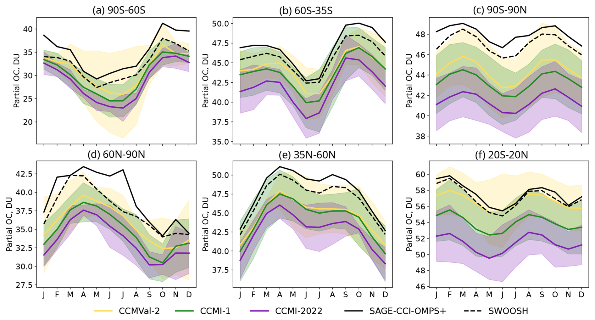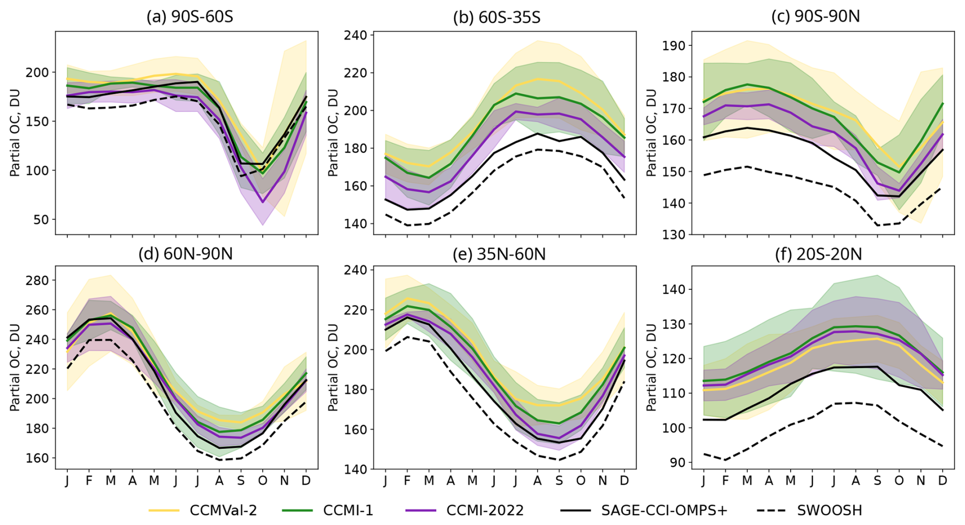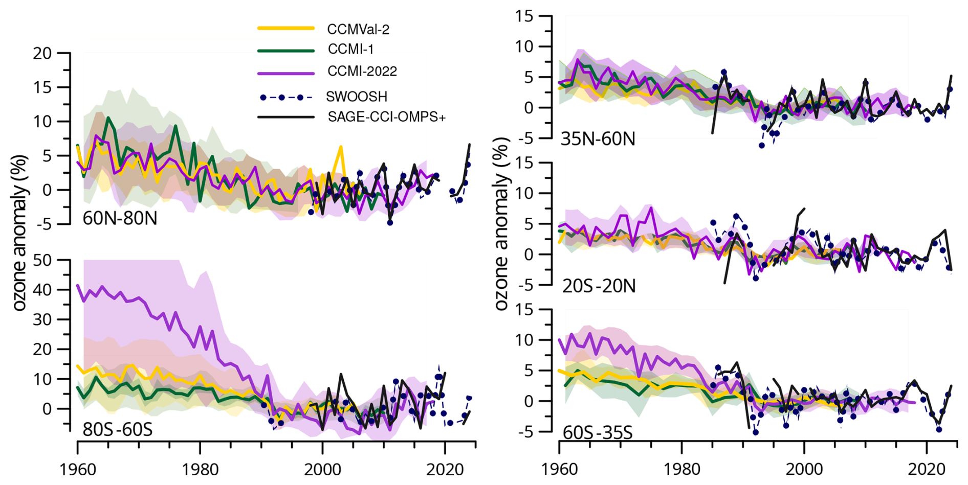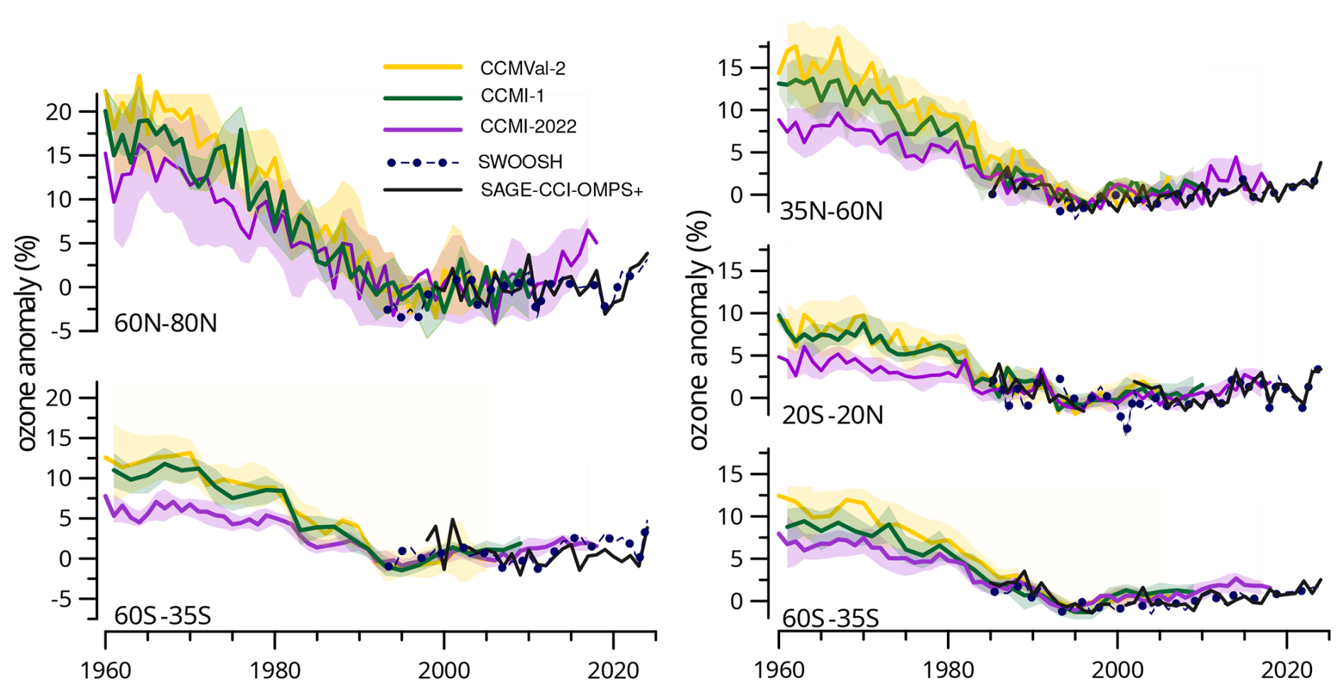 For ozone, we take advantage of a second, complementary satellite dataset SAGE-CCI-OMPS+ that combines a different set of sensors using an alternative merging method. It is a monthly zonal mean ozone product developed by ESA's Climate Change Initiative (CCI) and extended regularly as part of EC's Copernicus Climate Change Service (C3S). It provides ozone concentrations and deseasonalized anomalies from October 1984 to December 2024, in 10° latitude bands from 90° S to 90° N and on a 1 km altitude grid from 10 to 50 km. The record combines measurements from nine limb and occultation sensors (SAGE II/ERBS, POAM III/SPOT-4, OSIRIS/Odin, GOMOS/Envisat, MIPAS/Envisat, SCIAMACHY/Envisat, ACE-FTS/SCISAT, OMPS-LP/SNPP, and SAGE III/ISS). The merging method essentially consists of computing the median deseasonalized anomaly of the contributing sensors and hereby differs from the method used by SWOOSH. Also, SAGE II is the only common sensor used by SAGE-CCI-OMPS+ and SWOOSH, further increasing the independence between these data records. Key algorithm, intercomparison, and trend results are documented by Sofieva et al. (2017, 2023, 2025); Godin-Beekmann et al. (2022); WMO (2022). Despite their differences in input data and merging methodologies, both SWOOSH and CCI have been shown to exhibit similar interannual variability and trends in ozone (Sofieva et al., 2025; Godin-Beekmann et al., 2022). We use both datasets here in order to demonstrate the degree of observational agreement in the context of comparisons with models.