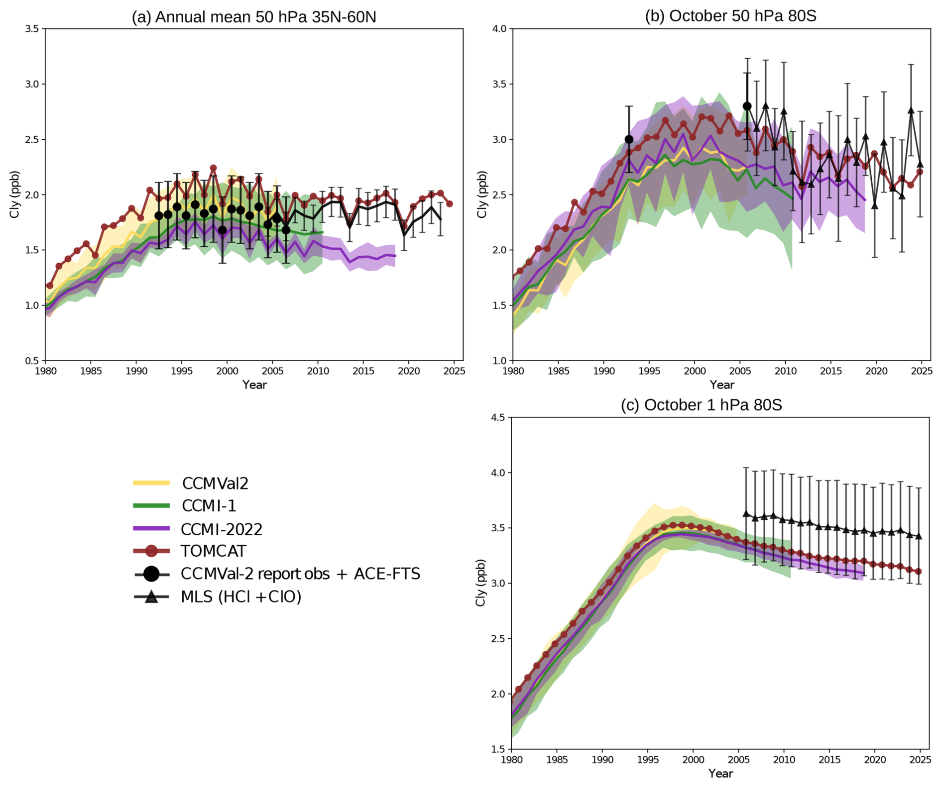 We use total inorganic chlorine (Cly) from the global offline TOMCAT 3-D CTM (Chipperfield, 2006), which includes a detailed representation of stratospheric chemistry (Chipperfield et al., 2018; Feng et al., 2021), including heterogeneous reactions on sulfate aerosols. The model is driven by ECMWF ERA5/5.1 reanalysis winds and temperatures (Hersbach et al., 2020), with 32 hybrid sigma–pressure levels from the surface to 60 km and a horizontal resolution of 2.8° × 2.8° (Dhomse et al., 2019). The surface mixing ratios of long-lived source gases, including major greenhouse gases (GHGs) and ODSs (e.g., CO2, CH4, N2O, CFCs, HCFCs), are prescribed following the WMO 2022 scenario. Additional chlorine sources from very short-lived substances (VSLS) are included which add about 100 pptv to the stratospheric Cly budget. Solar cycle variability is prescribed using solar flux data from the NRLSSI2 model (Coddington et al., 2019), and stratospheric sulfate aerosol surface area density is taken from Luo (2016). The TOMCAT Cly is used as a reference for this important metric as satellite observational datasets do not give complete coverage of all relevant chlorine species. Thus, TOMCAT provides a guide of the expected amount of stratospheric Cly from observed surface halocarbon trends. This metric relates to a fundamental process that ozone assessment models are designed to quantify, i.e. the depletion and recovery of ozone from specified halocarbon trends. In past intercomparisons CCMs have shown a wide spread in this metric (SPARC 2010).