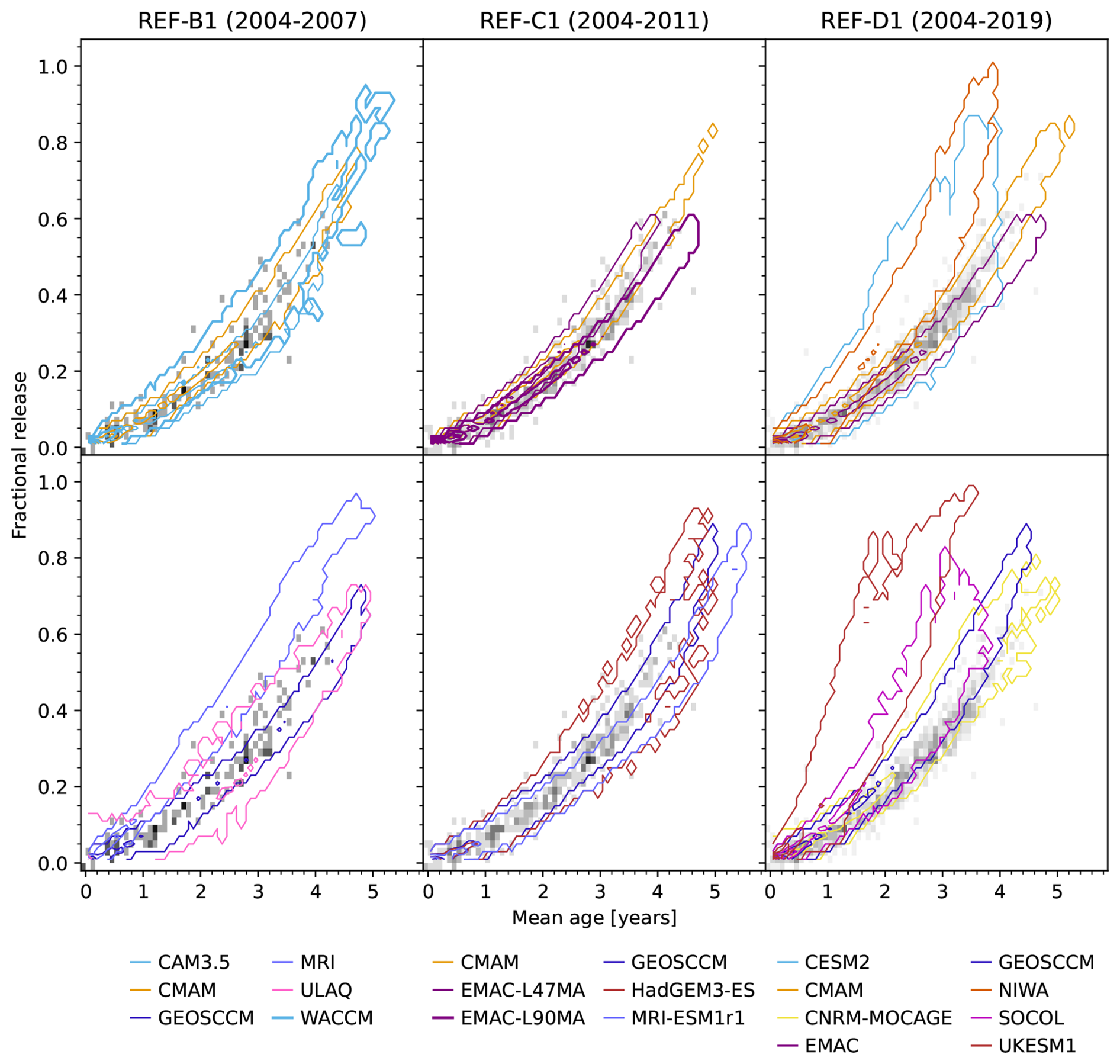 This Section evaluates the main transport diagnostics in the three generations of models. It first shows the mean age of air and decomposition into RCTT and mixing efficiency (Sect. 3.1), then addresses the BDC component due to the overturning mean meridional circulation (Sect. 3.2), then quasi-horizontal mixing between the tropics and the extratropics (Sect. 3.3). The polar processes, including polar downwelling and the polar vortex are discussed in Sect. 3.4, and finally the ozone climatology is evaluated in Sect. 3.5.