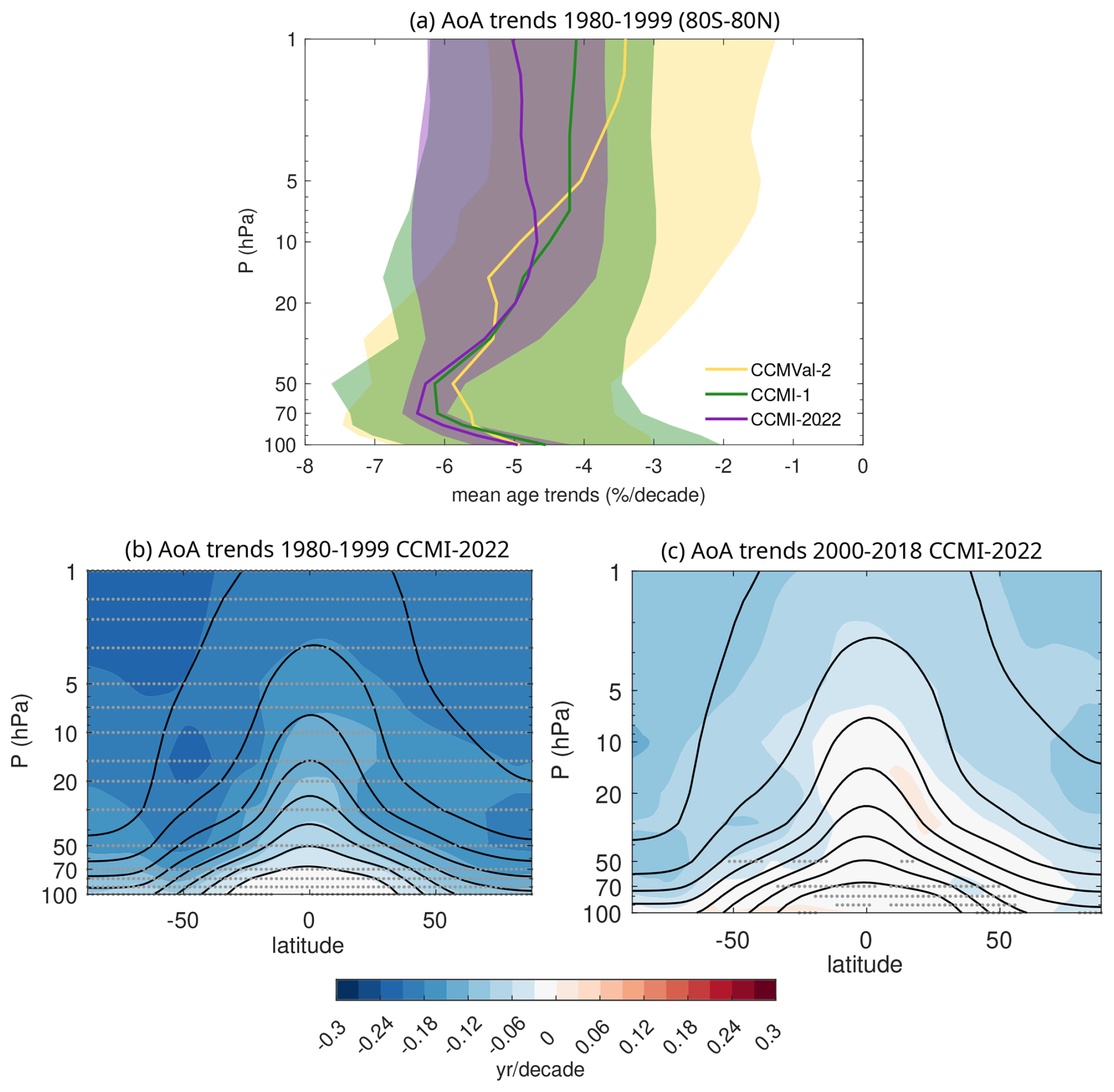 A number of studies have carried out multi-model evaluations of stratospheric transport. The first that we are aware of is Hall et al. (1999) on the evaluation of models in the NASA “Models and Measurements II” (MM2) study (Ko et al., 1999). This study evaluated 12 two-dimensional (latitude-height models) and 11 three-dimensional chemical transport models, with each model performing six transport experiments, including mean age and tropical “tape recorder” simulations. Early multi-model stratospheric CCM evaluations (Pawson et al., 2000; Austin et al., 2003) focused on the dynamics and chemistry, but not on transport, and the models did not perform consistent simulations. The next major multi-model transport evaluation was the Chemistry-Climate Model Validation Activity for Stratosphere-Troposphere Processes And their Role in Climate (CCMVal SPARC), which evaluated 13 CCMs that performed the same transient forcing simulations (Eyring et al., 2006). The CCMVal study included similar mean age and tape recorder diagnostics as MM2, but while the MM2 models were primarily chemical transport models, the CCMVal models had coupled chemistry and dynamics. The second phase of CCMVal (CCMVal-2) involved an extensive, coordinated evaluation of the CCMs that led to a number of peer-reviewed journal articles (e.g Strahan et al., 2011; Gettelman et al., 2010; Hegglin et al., 2010) as well as a formal SPARC report (SPARC, 2010). This evaluation considered a wide range of metrics for the chemistry, dynamics, and transport in the models, including the use of grading metrics (Douglass and Rodriguez, 1999; Waugh and Eyring, 2008) to quantify model-observational differences. While there have been two subsequent multi-model initiatives, CCMI-1 (Eyring et al., 2013; Morgenstern et al., 2017) and CCMI-2022 (Plummer et al., 2021), there has been less extensive/coordinated evaluation of these, although some studies have examined mean age and other transport metrics of models in the Fifth Climate Model Intercomparison Project (CMIP5; Hardiman et al., 2014), the IGAC (International Global Atmospheric Chemistry)/SPARC Chemistry Climate Model Initiative (CCMI-1; Dietmüller et al., 2018; Šácha et al., 2019; Orbe et al., 2020; Abalos et al., 2020), the sixth Climate Model Intercomparison Project (CMIP6; Abalos et al., 2021). The goals of this study are to provide a benchmark for the current representation of stratospheric transport in CCMs, to identify the main limitations and strengths, and to assess the progress made since the CCMVal-2 SPARC report (SPARC, 2010). Different from SPARC (2010), the approach we follow is not to assess the performance of individual models, but rather to provide an overview of the ability of the last three generations of CCMs (CCMVal-2, CCMI-1, and the new APARC (Atmospheric Processes And their Role in Climate)/IGAC CCMI-2022) in representing key processes. Note that, while what constitutes a model “generation” is open for debate, for readability we refer to the set of participating CCMs that were current at the time of each model intercomparison exercise as a generation. Hence, throughout the paper, the figures show the multi-model median (MMMed) and spread (defined as the median absolute deviation, MAD, or the 15th-to-85th percentile range) for the three generations. Nevertheless, since the information on each individual model can be useful for modelers and users, we include in the Supplementary Material the equivalent figures showing all the individual models.