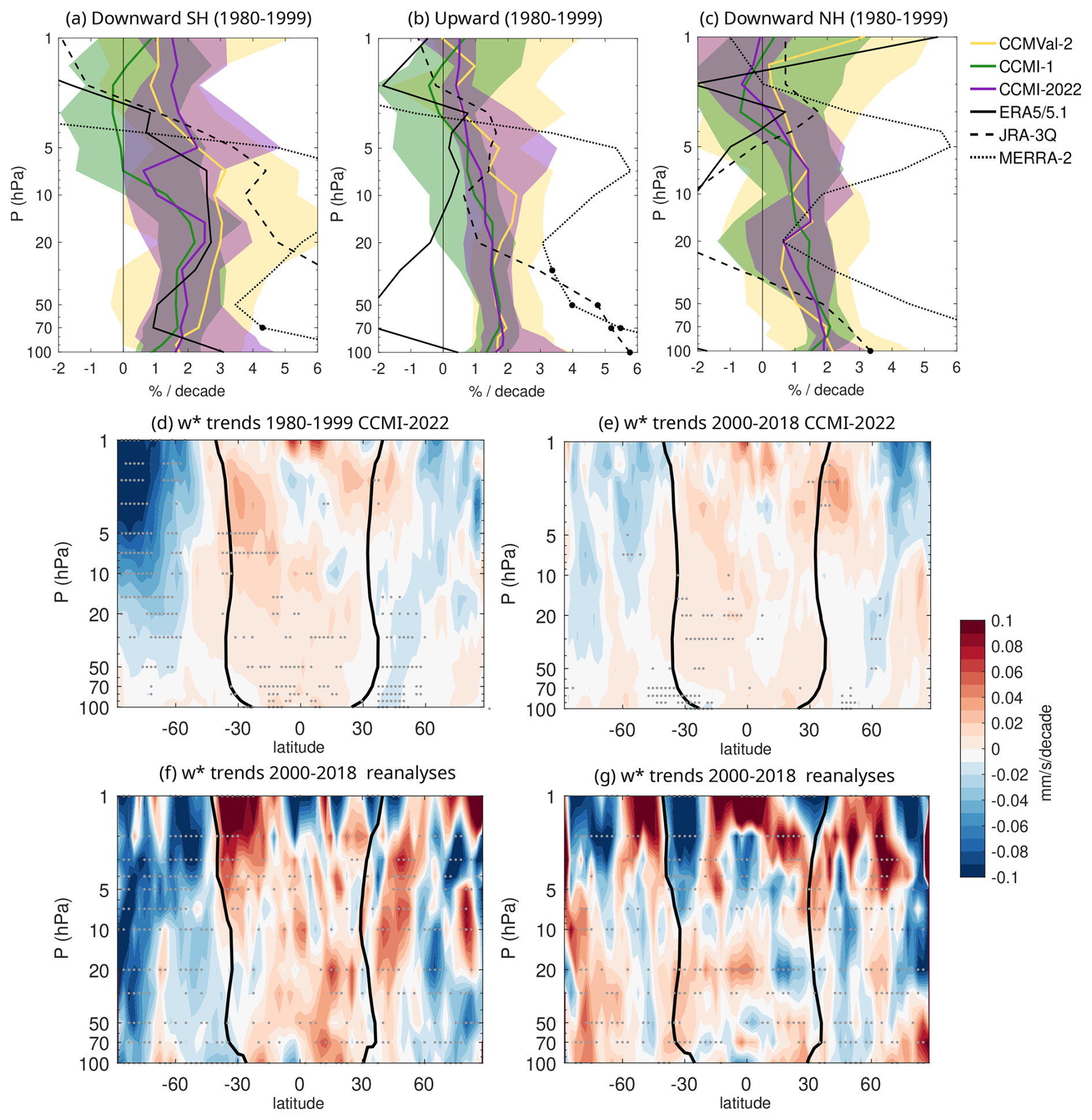 We use output from the historical simulations of the three latest generations of CCMs: CCMVal-2 refB1 (Eyring et al., 2006), CCMI-1 refC1 (Eyring et al., 2013; Morgenstern et al., 2017), and CCMI-2022 refD1 (Plummer et al., 2021). These are atmosphere-only historical simulations that use observations as boundary conditions for anthropogenic and natural emissions and prescribe sea surface temperature (SST) from observations. The quasi-biennial oscillation (QBO) is relaxed (nudged) towards observational winds in most simulations, but some models have an internally generated QBO. The time periods considered for these simulations (over which most of the models provided output) are 1960–2000 for CCMVal-2, 1960–2010 for CCMI-1, and 1960–2018 for CCMI-2022. We highlight that the different time periods covered by the generations implies that it is not possible to have a long overlap period that also covers the most recent decades when high quality observations are available. This implies that the periods are not exactly the same in the different datasets compared. We tried to minimize the impact of this caveat by averaging over long (20 years or more) time periods, adjusted to the different diagnostics and datasets.