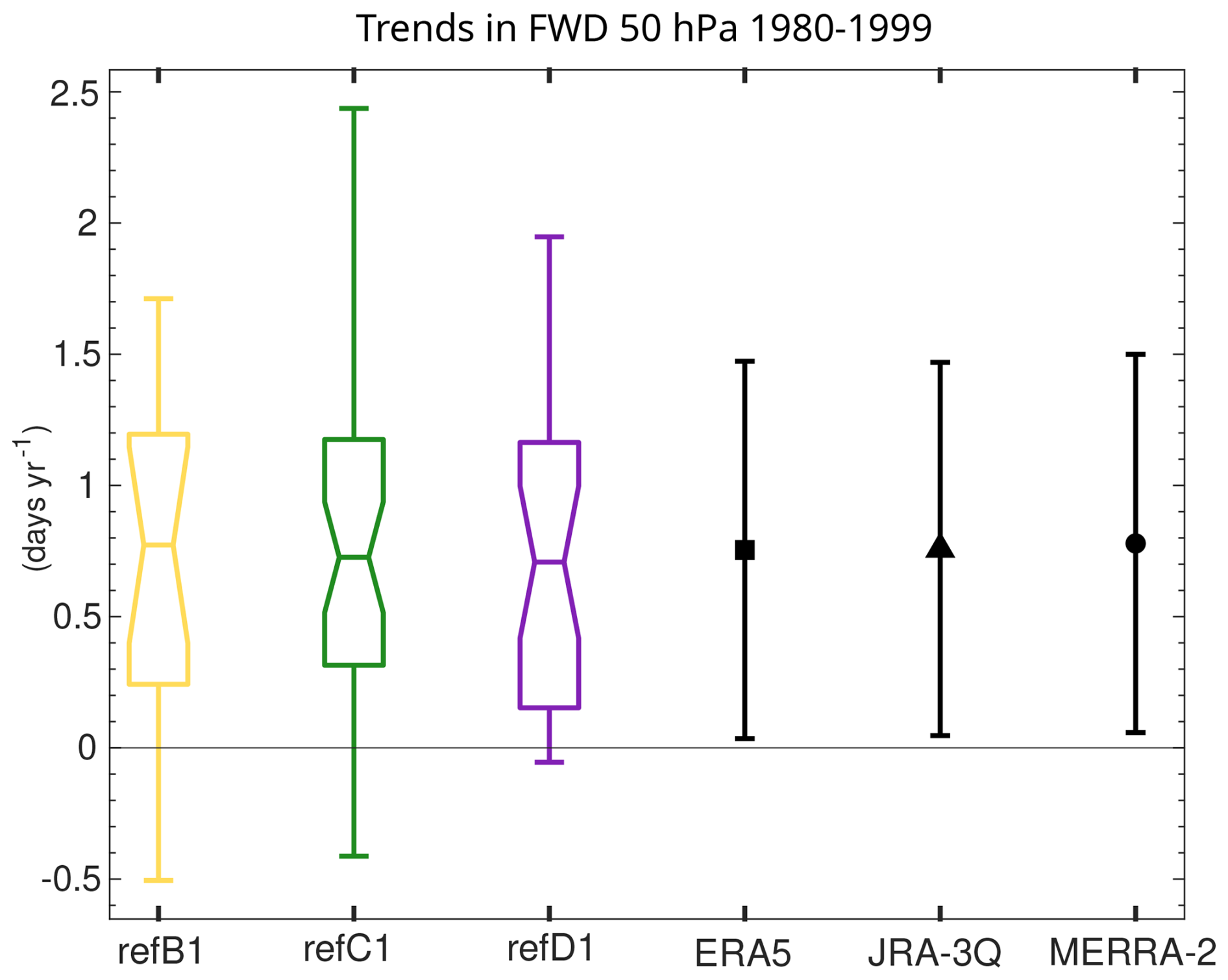 Monthly mean zonal mean output of the zonal mean wind (U) and residual circulation components have been downloaded from the Reanalysis Intercomparison Dataset (RID). The RID is an updated version of the dataset “Zonal-mean dynamical variables of global atmospheric reanalyses on pressure levels” (Martineau et al., 2018), and is now provided through the JAMSTEC RID server (https://www.jamstec.go.jp/ridinfo/, last access: 18 April 2026). The dataset provides data interpolated to a common grid with 73 latitudes and 22 pressure levels up to 1 hPa. For the residual circulation components, we used an upward extension of the RID available on the RID server, adding 13 pressure levels and extending the vertical coverage up to 0.01 hPa (35 pressure levels in total). In this upward extension, unlike in the standard RID product, the variables are derived from model-level data that were interpolated to pressure levels. The residual circulation is not directly observed, and there are important uncertainties in its magnitude across reanalyses (e.g., Abalos et al., 2015; Monge-Sanz and Birner, 2022; Fujiwara et al., 2024). By considering several reanalyses, we aim to account for this uncertainty. The residual circulation has been explored for ERA5 (Diallo et al., 2021) and JRA-3Q (Kobayashi and Iwasaki, 2024), and used in some studies for MERRA-2 (e.g., Orbe et al., 2020). The cold point and lapse rate tropopauses are the version 1 of the Jülich dataset (Hoffmann and Spang, 2022; Zou et al., 2023), for the same 3 reanalyses (ERA5/5.1, MERRA-2, and JRA-3Q).