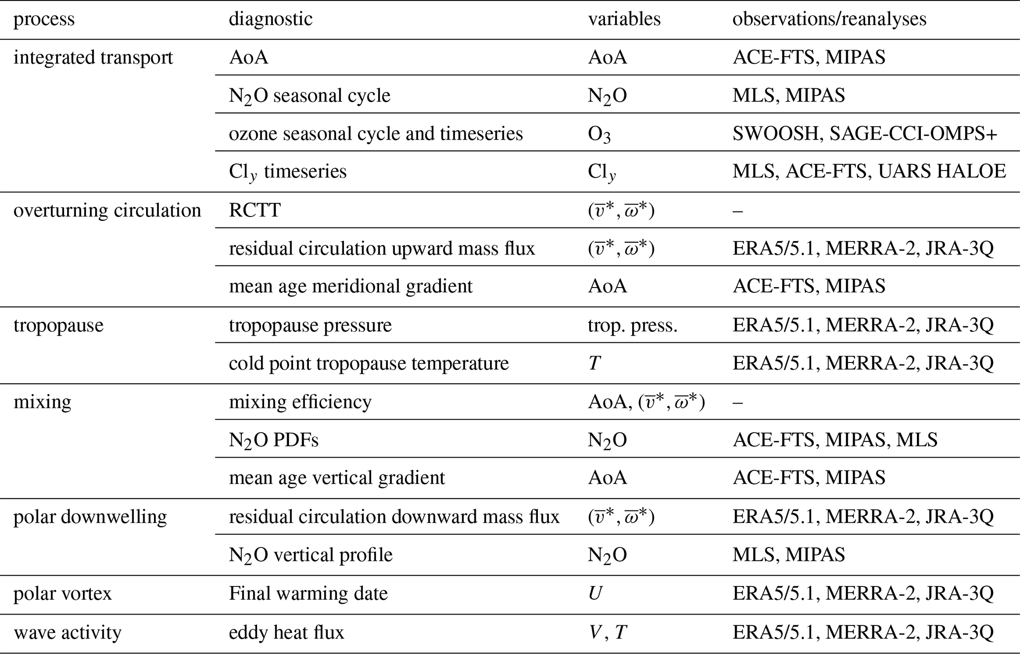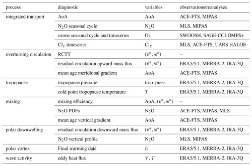The selected diagnostics encompass the main transport processes (advection and mixing), along with relevant dynamical features, integrated transport measures, and stratospheric ozone. We focus on the mean climatology, including the seasonal cycle, and also analyze past trends in a subset of diagnostics. Section 2 presents the observational and model datasets and describes the diagnostics. Section 3 addresses the climatology of transport diagnostics, Sect. 4 discusses the long-term trends over the last two decades of the 20th century, and Sect. 5 summarizes the main conclusions.