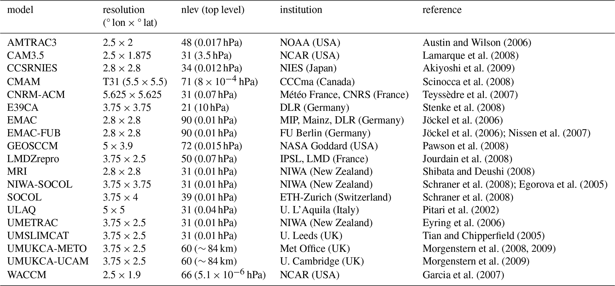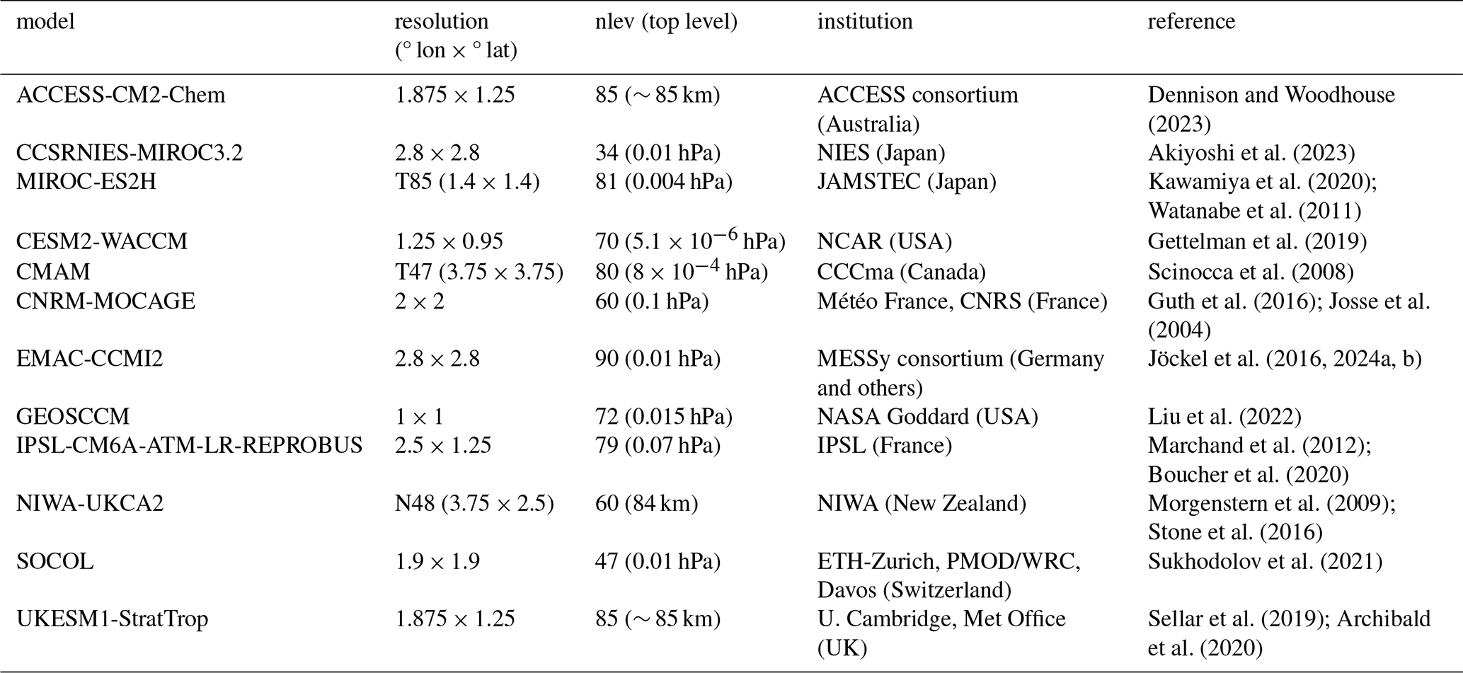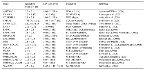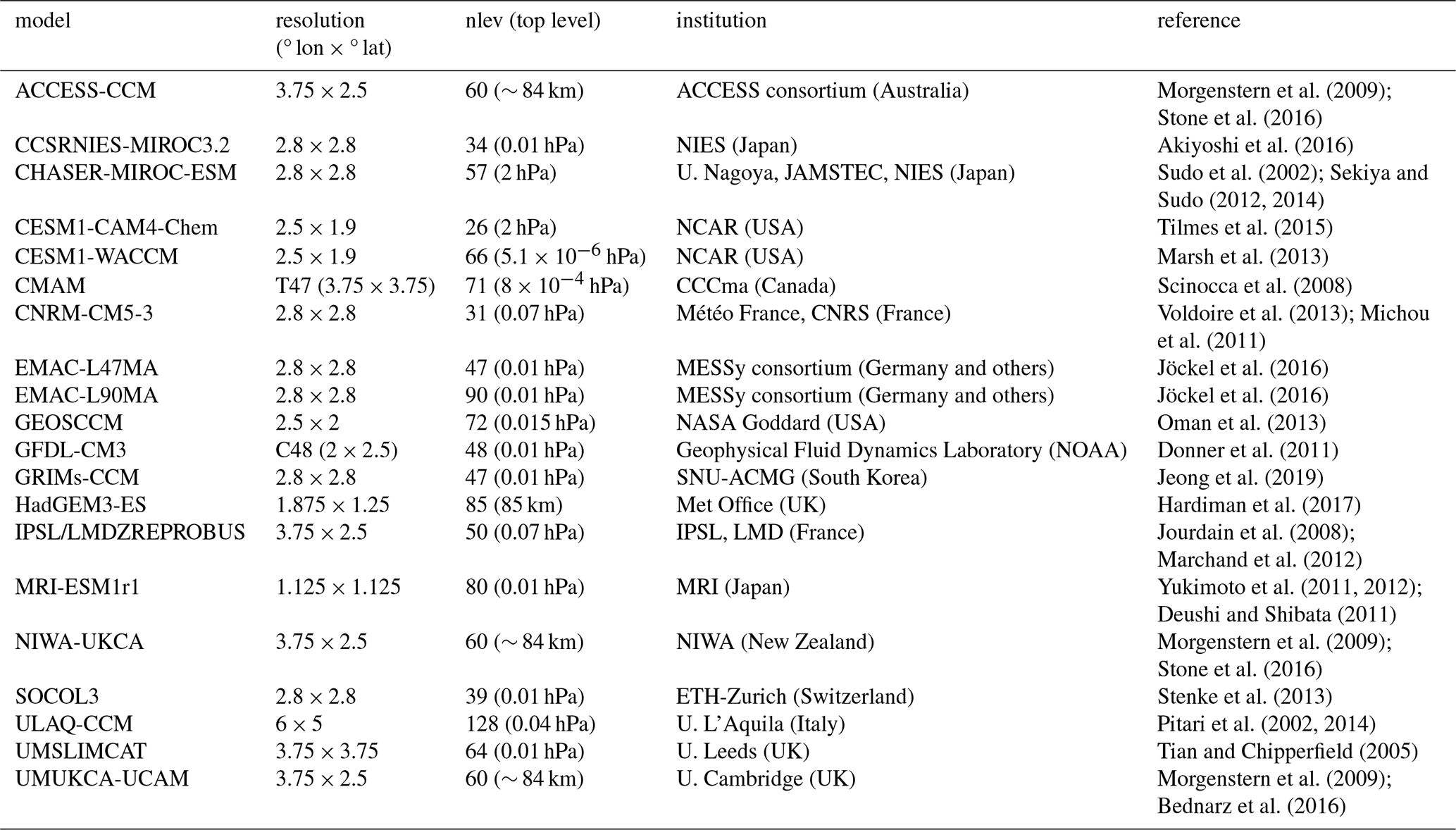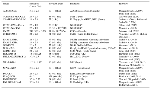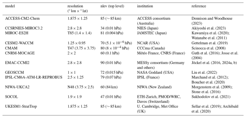 Morgenstern, O., Hegglin, M. I., Rozanov, E., O'Connor, F. M., Abraham, N. L., Akiyoshi, H., Archibald, A. T., Bekki, S., Butchart, N., Chipperfield, M. P., Deushi, M., Dhomse, S. S., Garcia, R. R., Hardiman, S. C., Horowitz, L. W., Jöckel, P., Josse, B., Kinnison, D., Lin, M., Mancini, E., Manyin, M. E., Marchand, M., Marécal, V., Michou, M., Oman, L. D., Pitari, G., Plummer, D. A., Revell, L. E., Saint-Martin, D., Schofield, R., Stenke, A., Stone, K., Sudo, K., Tanaka, T. Y., Tilmes, S., Yamashita, Y., Yoshida, K., and Zeng, G.: Review of the global models used within phase 1 of the Chemistry–Climate Model Initiative (CCMI), Geosci. Model Dev., 10, 639–671, https://doi.org/10.5194/gmd-10-639-2017, 2017. a, b