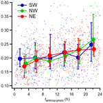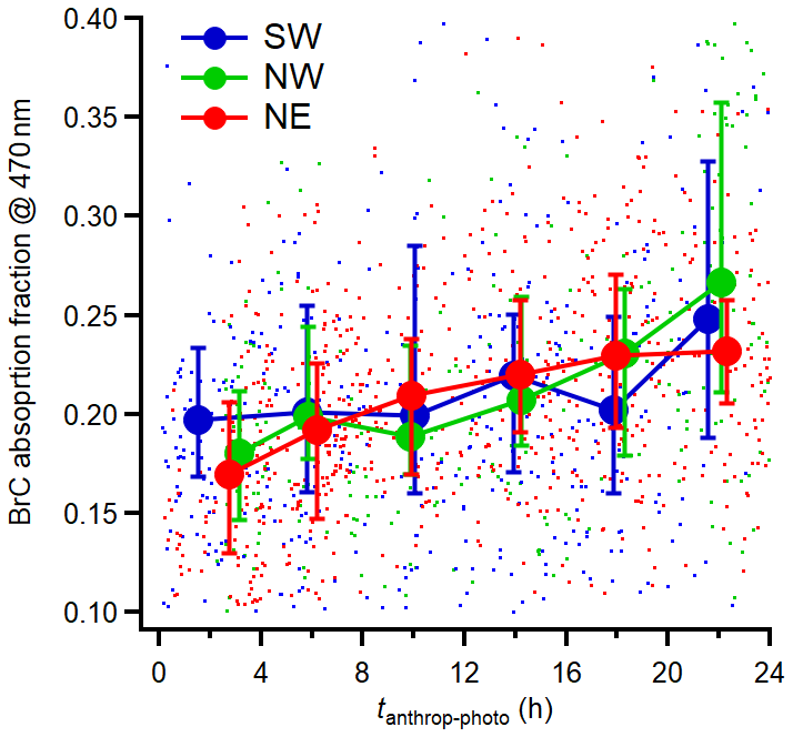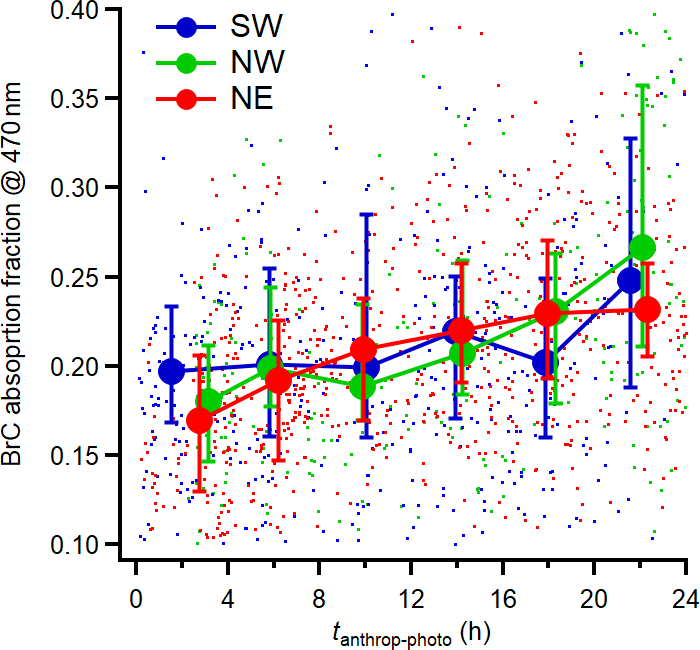 Figure 9Variations of absorption fraction of BrC at 470 nm as a function of tanthrop-photo. The results are averaged into 4 h intervals along tphoto and the error bar indicates the 25th and 75th percentiles, respectively.