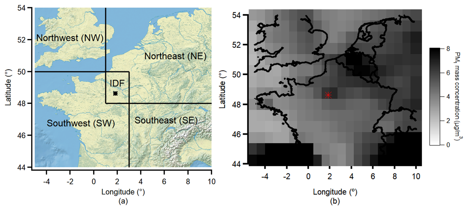 Figure 1(a) Classification of the potential air mass source regions; (b) ECMWF CAMS EAC4 (ECMWF Atmospheric Composition Reanalysis 4) reanalysis PM1 spatial distribution during the ACROSS campaign period. The dot in the figure represents the location of the Rambouillet measurement site. Maps were created from public domain GIS data on Natural Earth (http://www.naturalearthdata.com, last access: 1 April 2025).