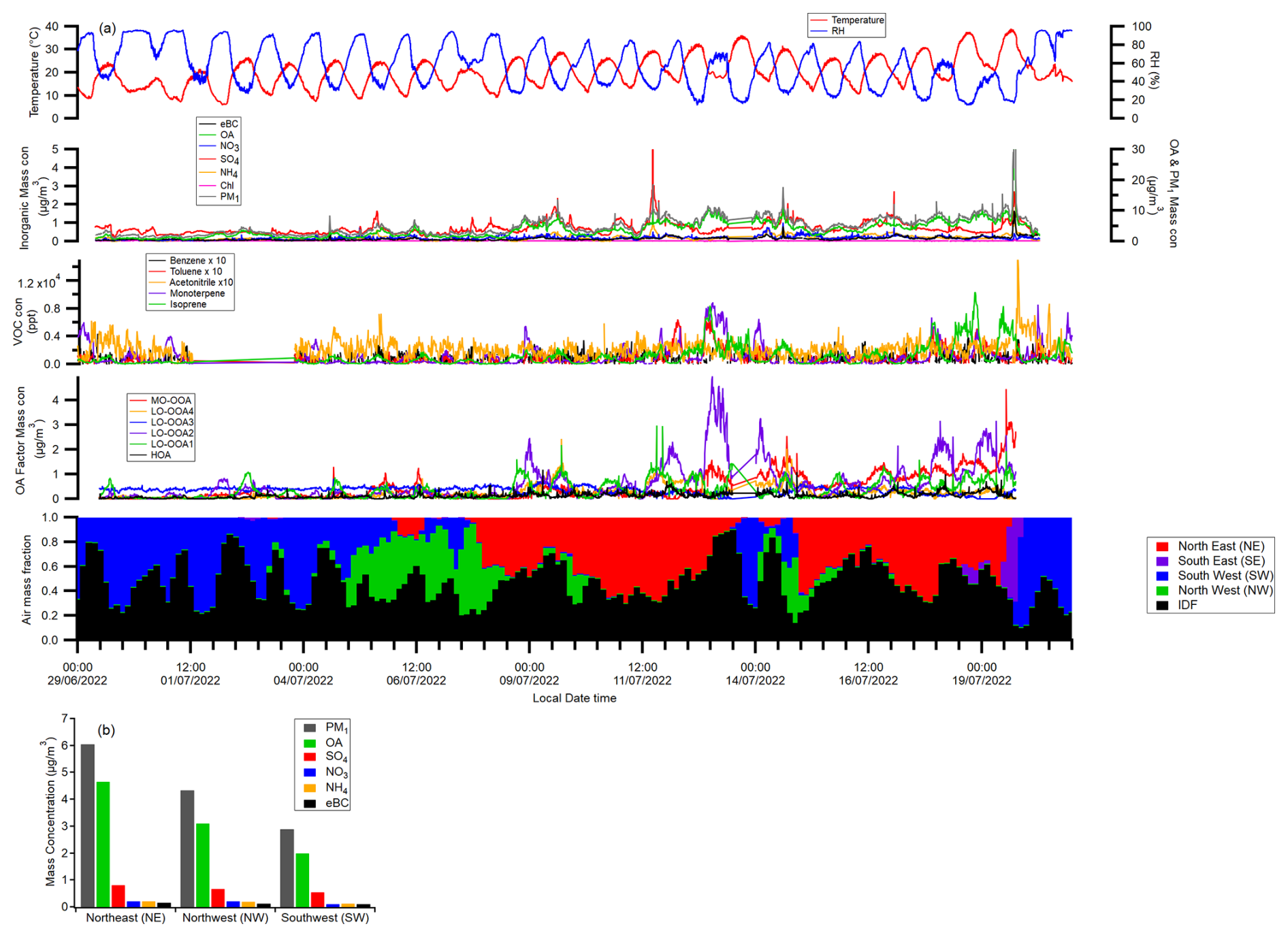 Figure 2(a) Time series of temperature, RH, PM1, VOC, PMF OA factors and historic air mass fractions; (b) the average PM1 composition mass concentrations under different external air mass dominated periods.