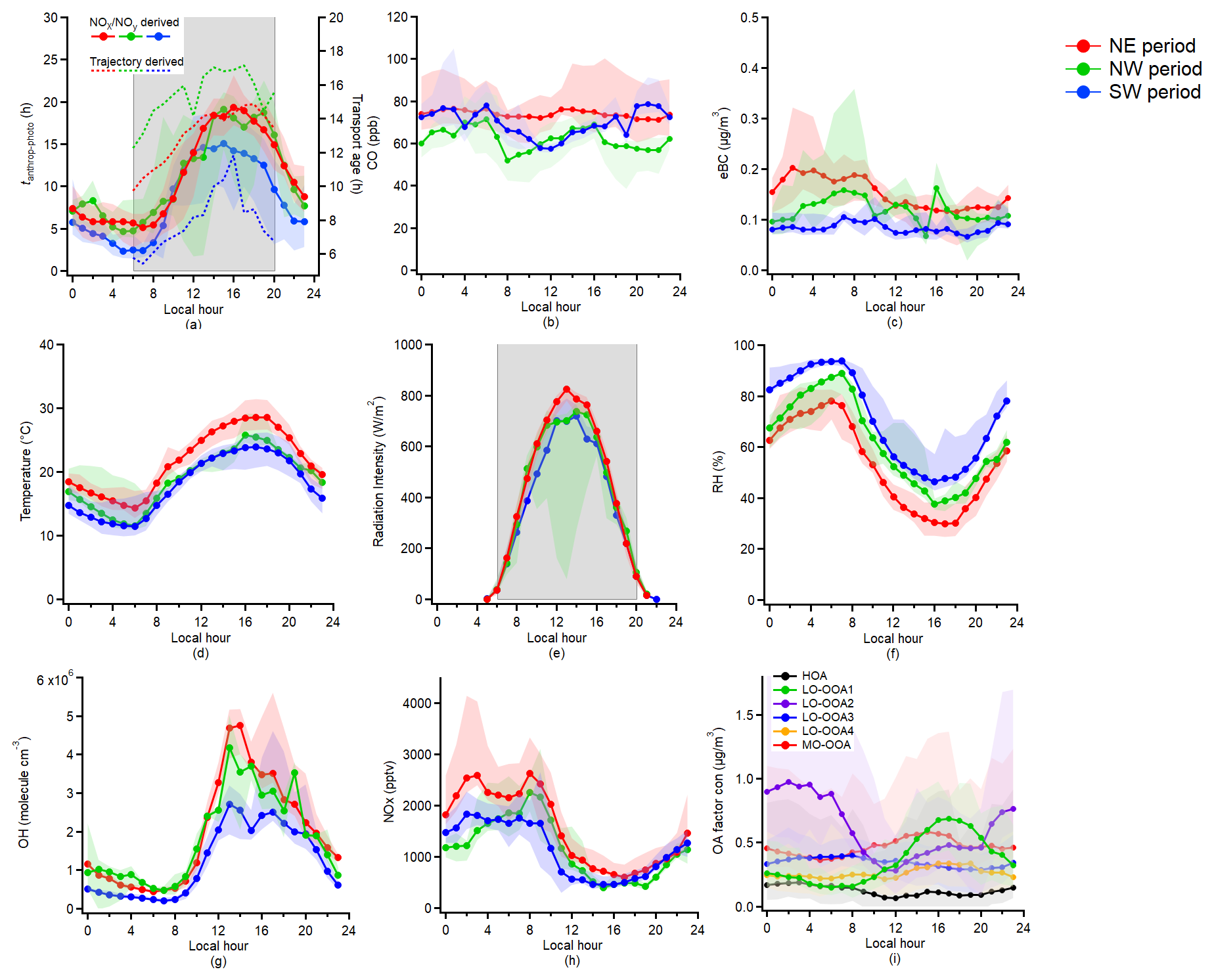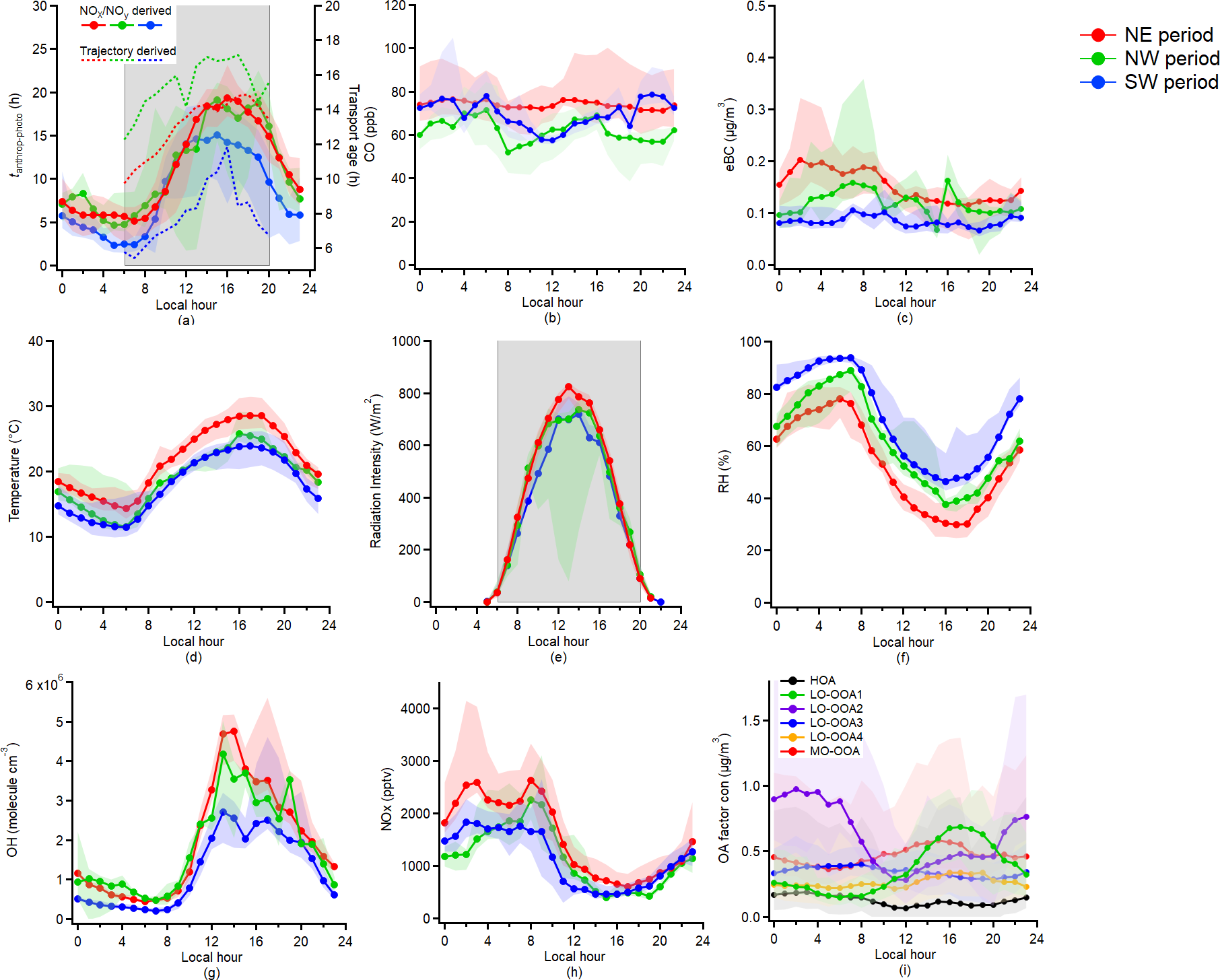 Figure 3Diurnal variation of the (a) Relative anthropogenic photochemical age (tanthrop-photo) derived from NOx NOy ratio and trajectory-derived transport age; (b) CO mixing ratio; (c) eBC mass concentration; (d) Temperature; (e) Radiation Intensity; (f) RH; (g) OH concentration; (h) NOx concentration; (i) PMF OA factors. The grey shades in panels (a) and (e) indicate the periods for the photochemical aging analysis. The lower and upper whiskers in the figure are the 25th and 75th percentiles, respectively.