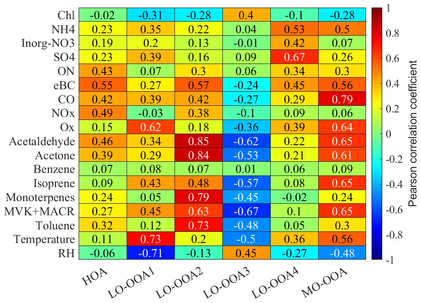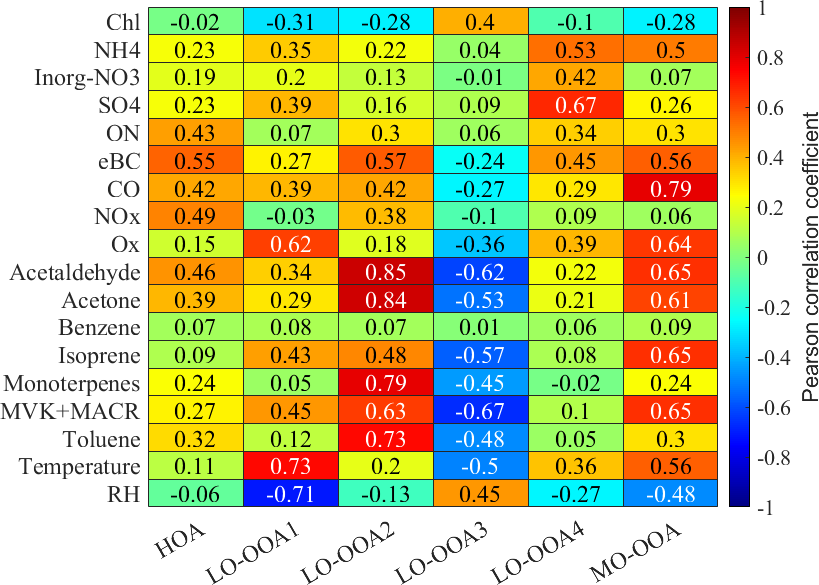 Figure 4 presented the average mass spectra of the resolved six PMF OA factors: one Hydrocarbon-like OA (HOA) and five OOA factors. The Pearson correlation coefficient (r) between the HR-AMS PMF factors and the external tracers is presented in Fig. 5. The time series of the PMF-derived OA factors between 29 June and 20 July 2022, is presented in Fig. 2a. Figure 3i shows the diurnal variations of the OA factors, and Fig. 6 presents the mass fractions of the OA factors according to the dominated air mass periods. The comparison between below- and above-canopy PMF results is provided in the Supplement, showing that the trends of NR-PM1 and PMF for below- and above-canopy were consistent during the daytime throughout the campaign. Thus, the influence of localized fresh plumes and nearby human activities was minimal since the boundary layer was well mixed during the daytime during the campaign period, supporting our subsequent findings on regional pollution within the boundary layer during the daytime.