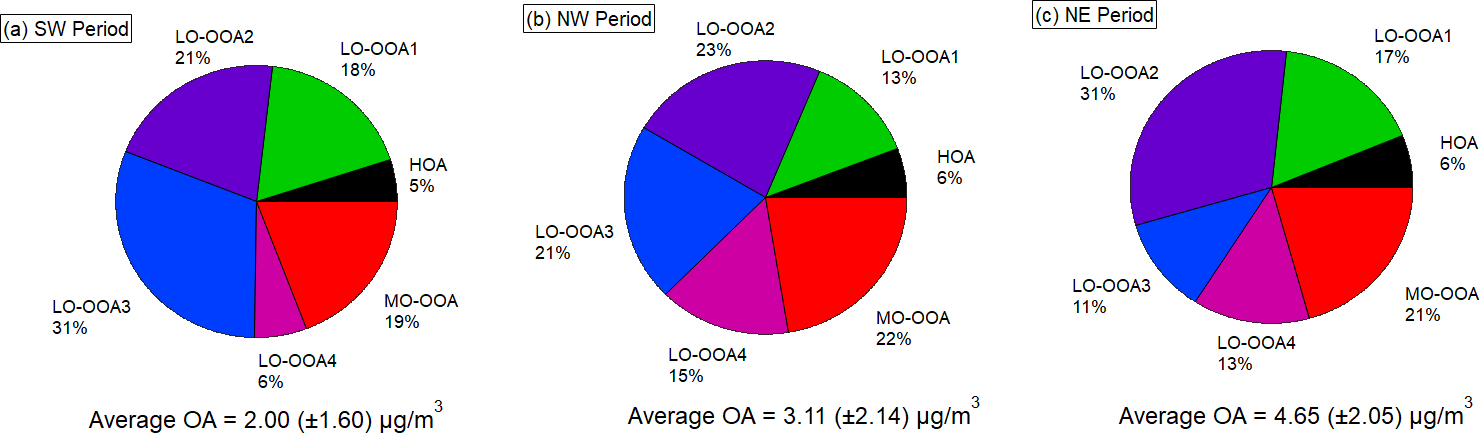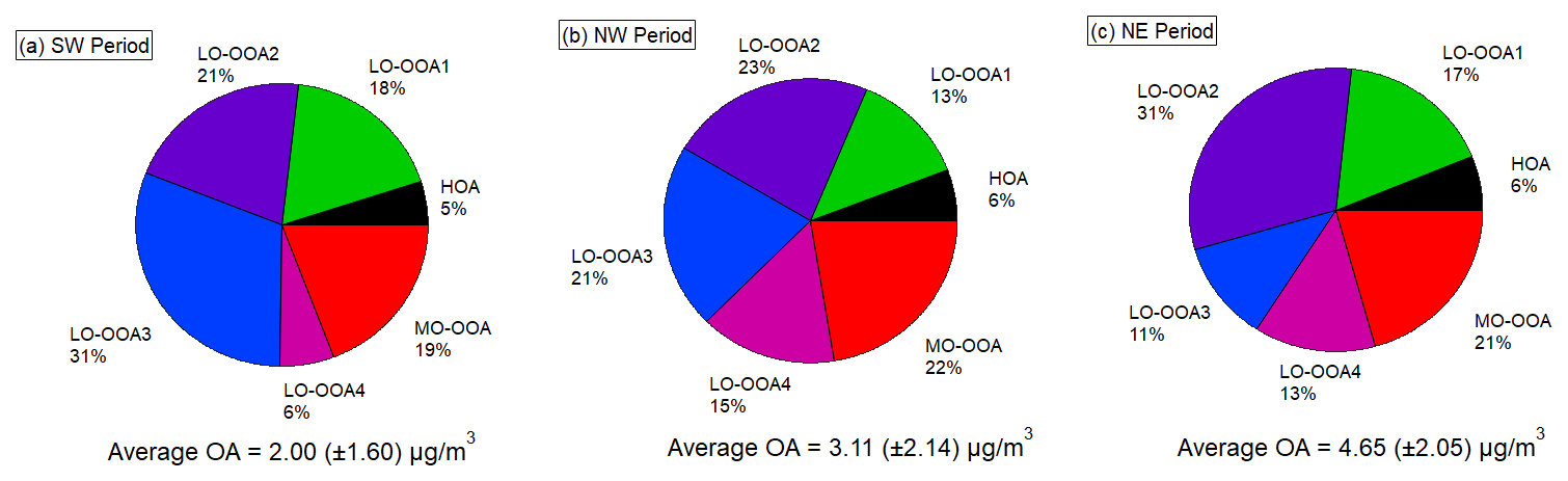 Figure 6Pie charts for the mass fractions of different PMF OA factors during the three different airmass dominated periods. Values are reported as mean ± standard deviation.