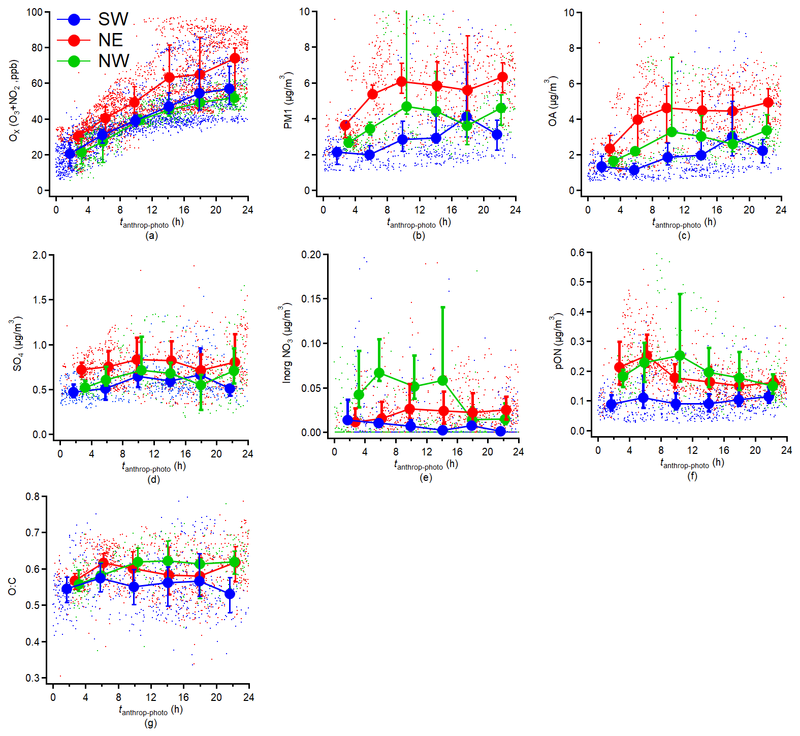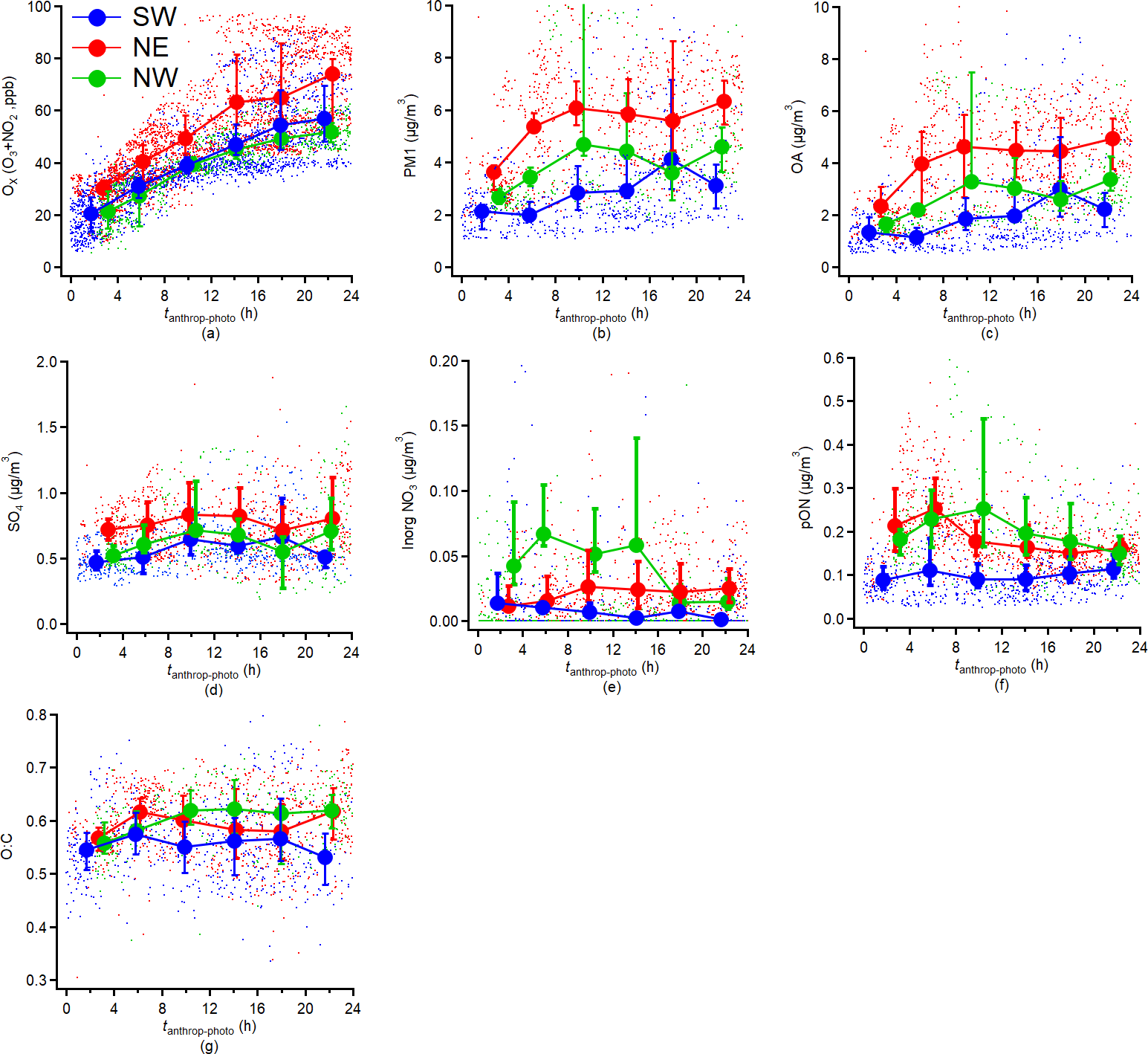 Figure 7Variations in aerosol compositions concentrations: (a) Ox (O3 + NO2), (b) PM1, (c) OA, (d) Sulfate, (e) Inorganic nitrate, (f) particulate Organic Nitrate (pON), (g) O : C ratio measured by HR-AMS as a function of tanthrop-photo. The results are averaged into 4 h intervals along tanthrop-photo and the error bar indicates the 25th and 75th percentiles, respectively.