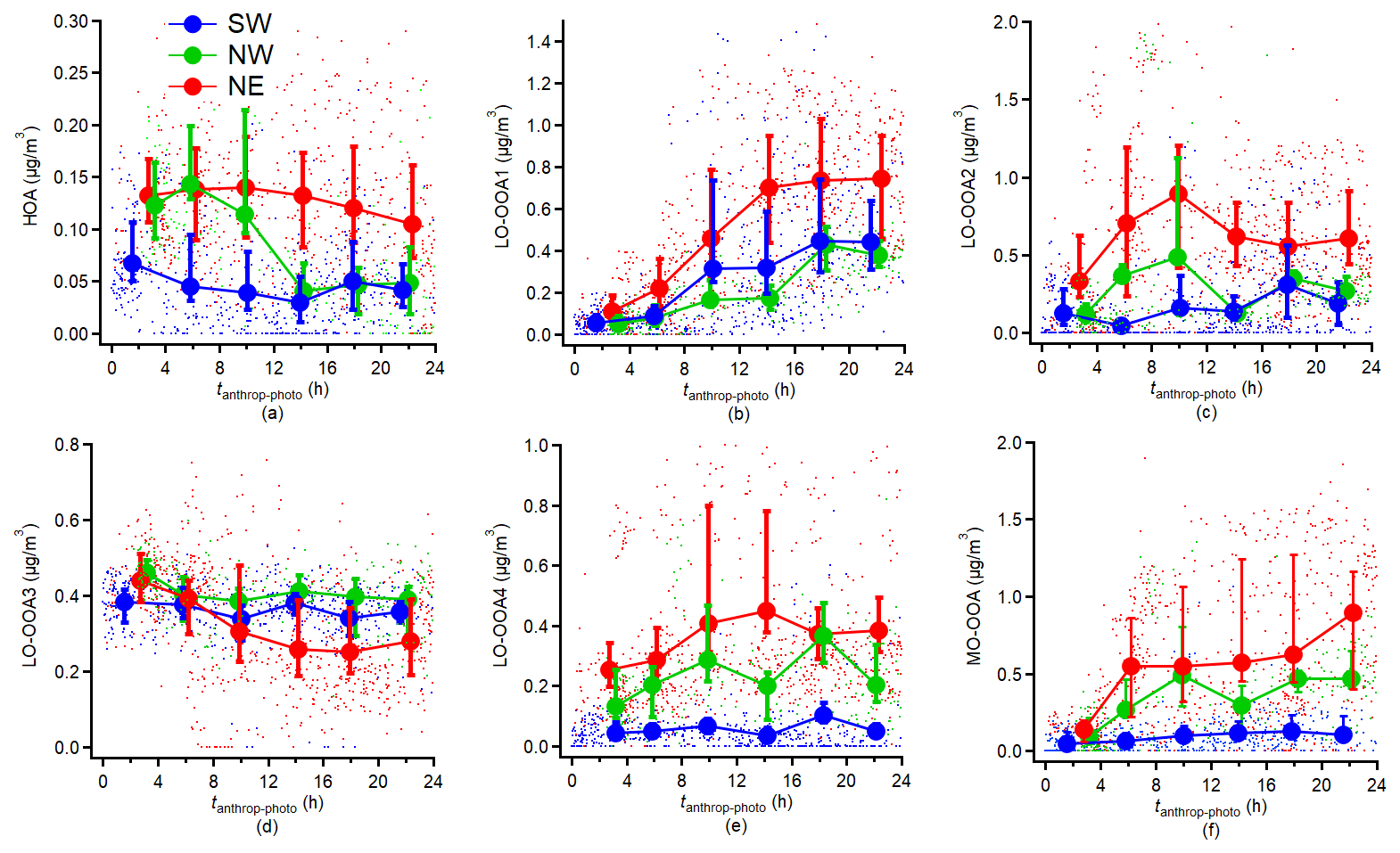 Figure 8Variations in (a–f) HR-AMS PMF-derived factors normalised or non-normalised concentrations. The results are averaged into 4 h intervals along tanthrop-photo and the error bar indicates the 25th and 75th percentiles, respectively.