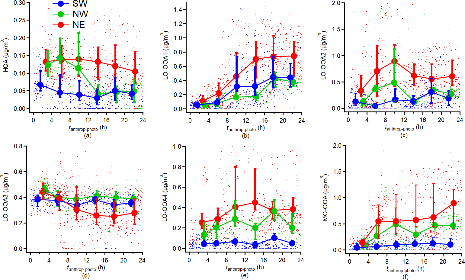 The PM1 concentration, shown in Fig. 7b as a function of tanthrop-photo, exhibited an increase across all three periods with higher tanthrop-photo, and the OA mass concentration doubled following a relative ∼ 24 h photochemical aging process as presented in Fig. 7c. This high OA increase combined with no significant relative increase of other aerosol components (SO4, organic and inorganic NO3; Fig. 7d–f), indicates that photochemical OA formation played a dominant role in the observed increase in total PM1 mass after approximately 24 h of tanthrop-photo. This finding aligns with previous studies in Europe, which have shown that OOA formation substantially contributes to summer PM1 levels (Chen et al., 2022; Zhang et al., 2019). The increasing trend of OA also agreed with the results previously observed in urban plumes from Paris, Mexico City, and Seoul (Freney et al., 2014; DeCarlo et al., 2010; Nault et al., 2018) during photochemical process. However, there was a slight increase in the average bulk O : C ratio as a function of tanthrop-photo only during the NW period. Indeed, the average bulk O : C ratio did not show a corresponding increase with tanthrop-photo during the SW and NE period; instead, a slight decrease was observed at higher tanthrop-photo during the NE period. The average bulk O : C ratio at tanthrop-photo = 0 was approximately 0.55 across all periods, which was higher than the O : C ratios of most LO-OOA factors (LO-OOA1–3). This suggests that the regional background OA was already substantially oxidized prior to further photochemical processing. Consequently, additional aging may not necessarily lead to large increases in the average bulk O : C ratio. Other field studies in remote areas also report oxidation indicators reached a steady state rather than continuing to rise with photochemical age (Irei et al., 2015). During the NE period, the temporal evolution of bulk O : C exhibited a non-monotonic behaviour. Between 0 and 8 h of tanthrop-photo, the increase in MO-OOA contributed to a rise in average bulk O : C ratio. However, after ∼ 8 h, the more rapid formation of LO-OOA1 led to a greater relative contribution of less-oxidized components, thereby lowering the overall bulk oxidation level. As a result, the average bulk O : C decreased as tanthrop-photo increased from 8 to 20 h. Measurements in American urban environments report that LO-OOA increase more rapidly than MO-OOA during periods of active photochemical processing (Guo et al., 2024; Rogers et al., 2025).