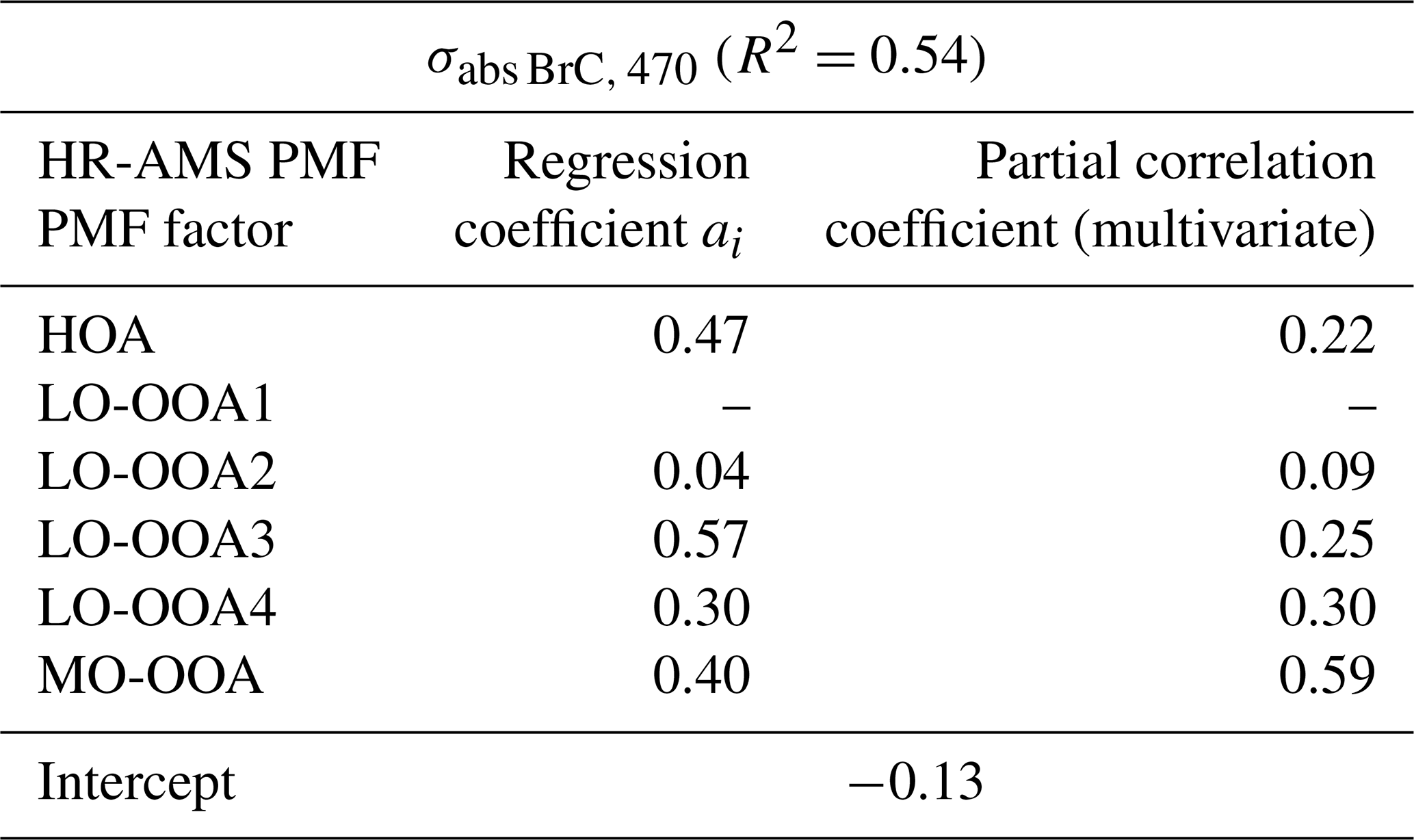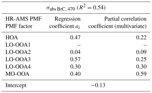 Table 1Results of multiple linear regression (MLR) between σabs BrC, 470 and individual PMF-derived factors. The final regression excludes the LO-OOA1 due to its negative regression coefficient value (−0.06). The Variance Inflation Factors (VIF) for HOA, LO-OOA2, LO-OOA3, LO-OOA4, and MO-OOA were 1.48, 1.16, 1.71, 2.27 and 1.31, respectively. Results include all the PMF-derived factors are presented in Table S2 in the Supplement.