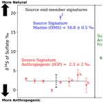 After this correction, the nss-δ34S was used in a binary model to apportion the relative contributions from anthropogenic-fossil sources (e.g., ship emissions/IGP sources) vs. the marine biogenic (DMS) source, using Eq. (5):