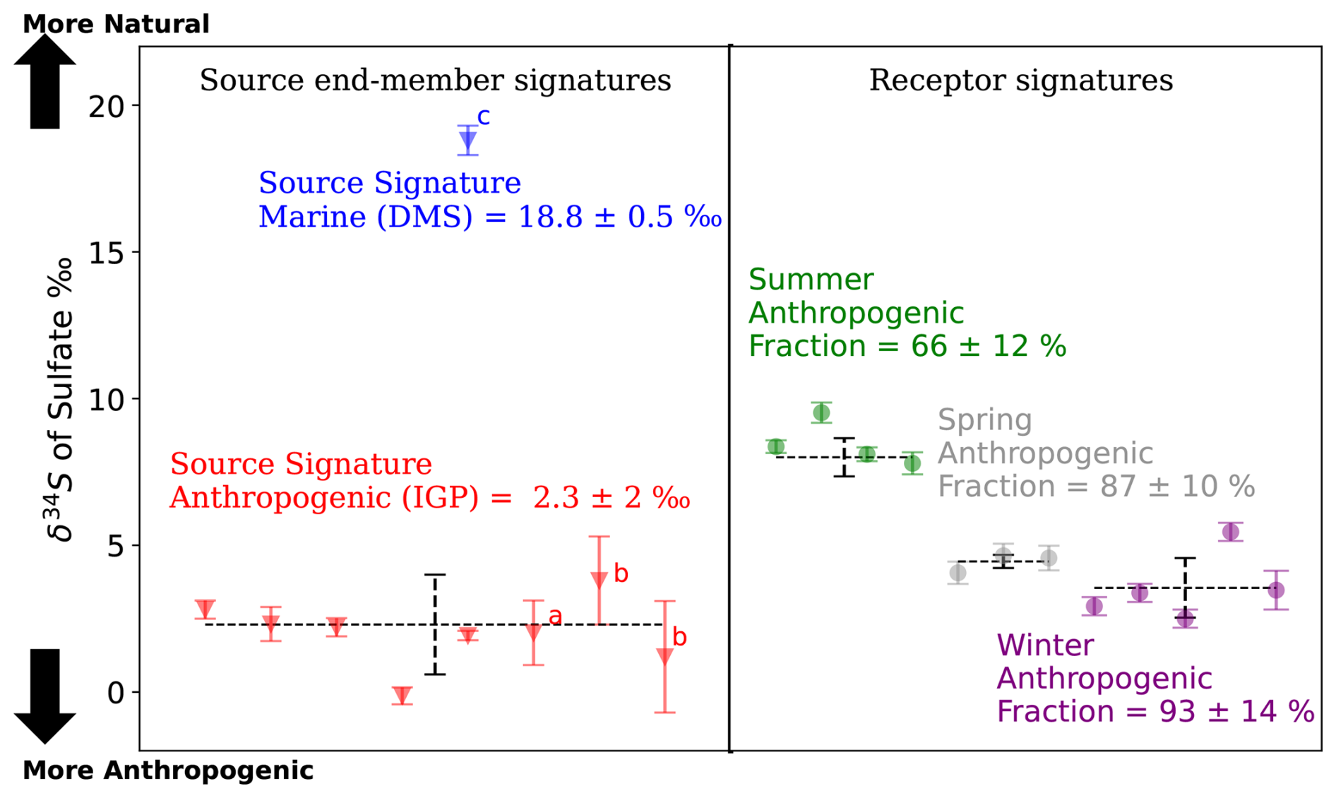 Figure 2Sulfate δ34S composition for MCOH and end-members: IGP source signature (this study, n= 5; a = Dasari and Widory, 2024, n= 15; b = Sawlani et al., 2019, n= 30), DMS source signature (blue; c = Amrani et al., 2013, n= 16). MCOH summer (green), spring (grey), and winter (purple). Error bars for this study's samples show ±4σ (instrumental analytical precision, per measurement). Literature points and seasonal aggregates show ± 2σ (between-sample standard deviation).