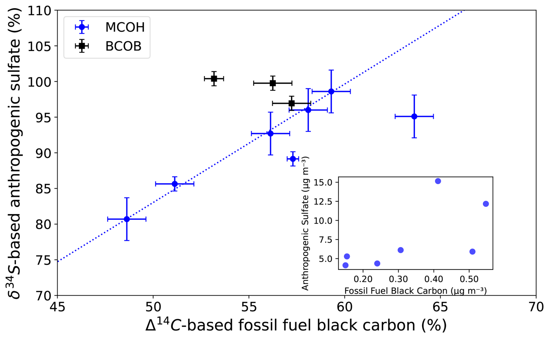 Figure 3Relationships between fossil fuel black carbon and anthropogenic sulfate for MCOH (spring, summer; blue circles) and BCOB (black squares), calculated using isotopic composition (Δ34C, δ34S). The inset graph shows the actual concentrations of fossil fuel black carbon and anthropogenic sulfate for MCOH.
