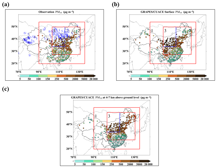 Figure 1Observed and simulated affected areas of the dust events from 11 to 15 April (region 1 is DA; region 2 is DPA; region 3 is NDSA). (a) Observed distribution of most sever dusty weather phenomena and maximum PM10 concentration for each station during the test time; (b) Same as (a) but for maximum PM10 concentration by GRAPES/CUACE; (c) Maximum PM10 concentration distribution in the layer of 4–7 km in height by GRAPES/CUACE.
