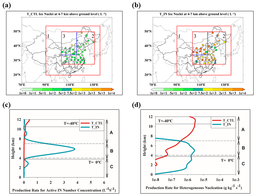 Dust provides ice nuclei via heterogeneous nucleation during dust precipitation events. The online aerosol–IN nucleation scheme significantly modifies the distributions of nucleated IN concentrations. The original WDM6 scheme exhibits a systematic underestimation of ice-nuclei concentrations, with nucleated IN concentrations reaching 102 L−1 between 4 and 7 km altitude during the dust-precipitation event, and abnormally increasing with height due to its temperature-dependent formulation, peaking near the −40 °C layer. With the online aerosol–IN nucleation scheme, IN concentrations can reach 104 L−1, so for the cloud ice mass production rate, concentrated peaking at about the layer between 4 and 7 km in height, closer to the observations