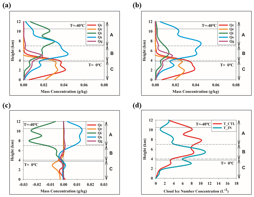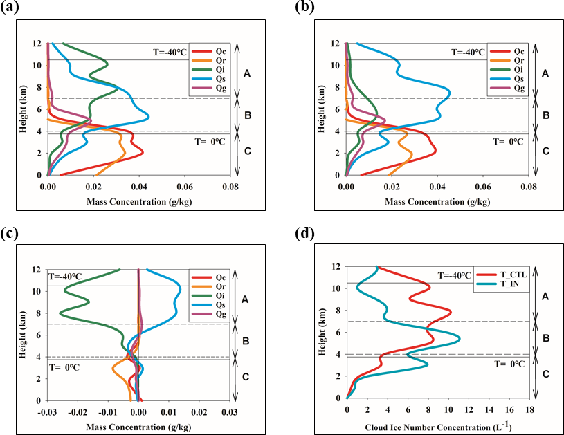 Figure 3Distributions of hydrometeors, averaged over the dust–precipitation period (00:00 UTC 11 April–00:00 UTC 15 April 2018) and over dust–precipitation stations: (a) hydrometeors simulated in T_CTL (b) hydrometeors simulated in T_IN (c) hydrometeors difference by (T_IN- T_CTL); (d) DP event-averaged vertical distributions of cloud ice number concentration.