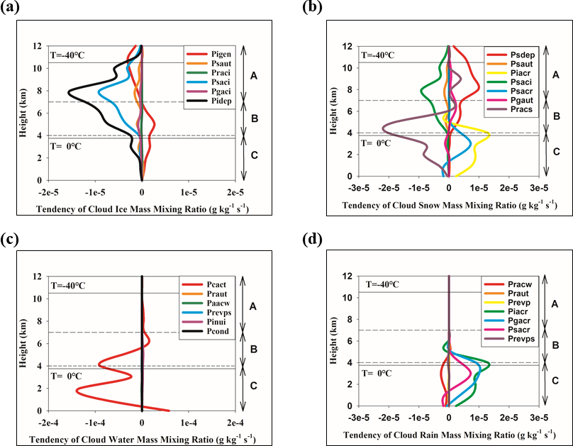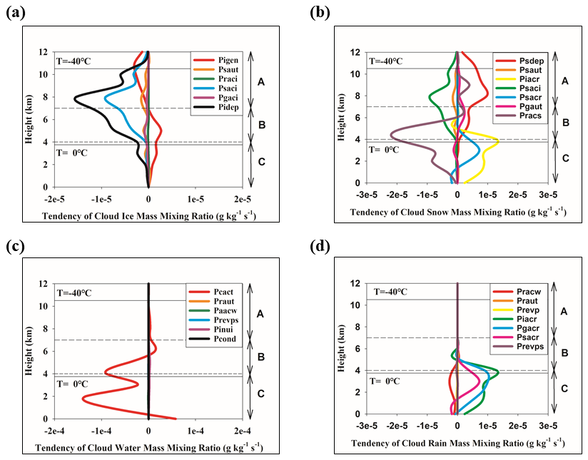 In layer C, although the model diagnostics indicate an enhancement in cloud-snow production processes (production rate for accretion of rain by snow (Psacr) and production rate for accretion of rain by cloud ice (Piacr)) and a reduction in the production rate for accretion of snow by rain (Pracs), newly formed cloud snow cannot be maintained because the temperature is already above 0 °C which makes it instantaneously melt, rapidly converting to rain. As a result, there is no significant change in snow mass concentration in this layer.