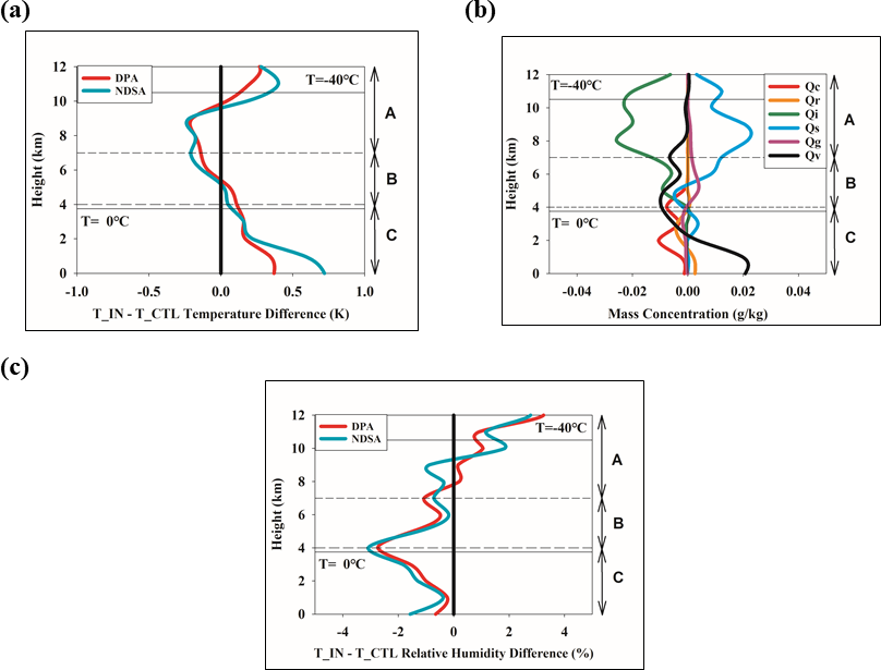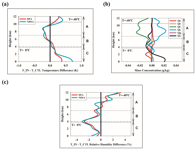 Figure 5Vertical distributions of temperature difference and relative humidity difference, averaged over dust–precipitation stations from 18:00 UTC 11 April to 18:00 UTC 12 April: (a) Temperature difference (T_IN-T_CTL) (b) Differences in hydrometeor and water vapor mixing ratios (T_IN-T_CTL). For clarity, the water vapor changes are scaled to one-tenth of their actual values. (c) Relative humidity difference (T_IN-T_CTL).