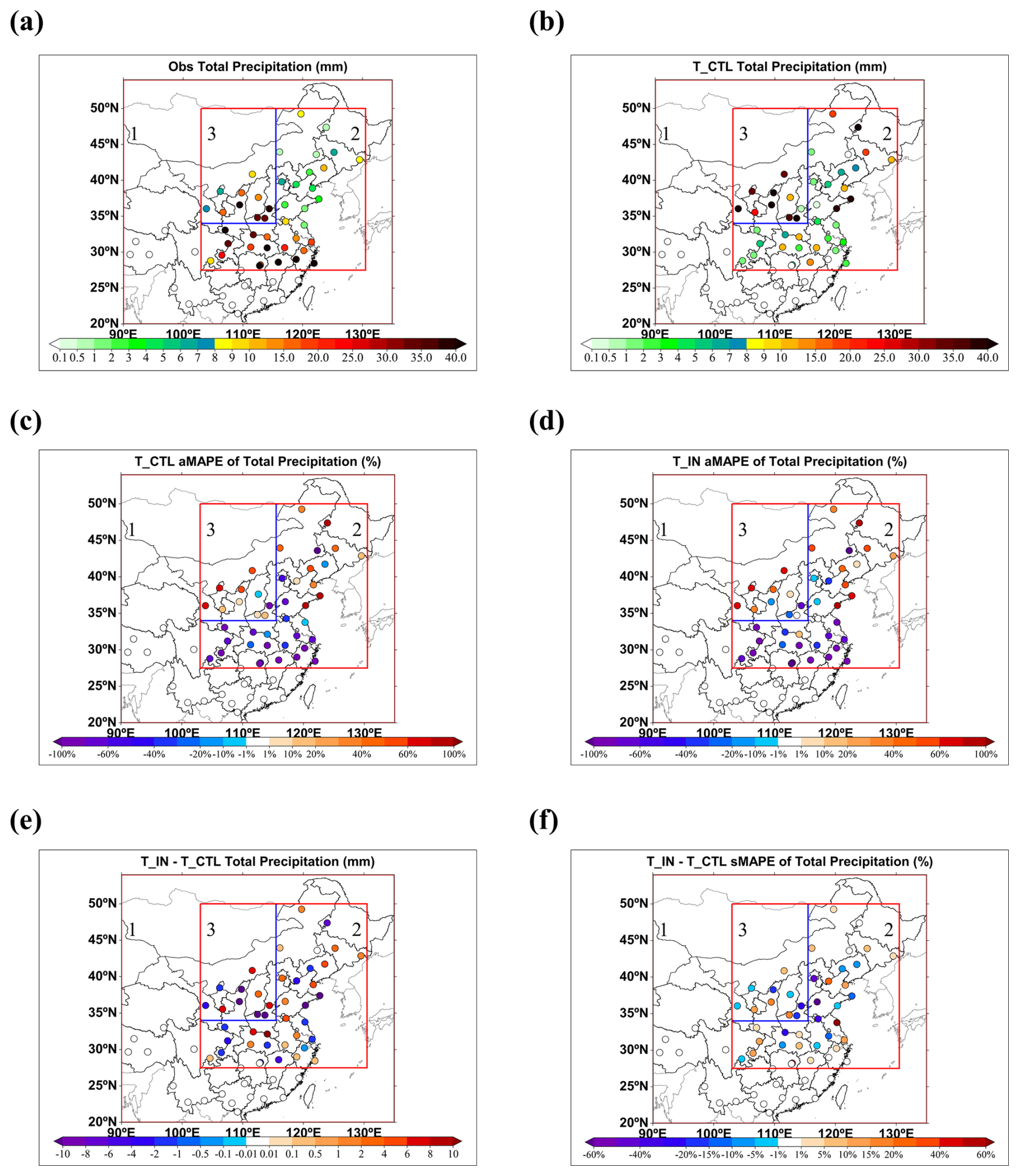Figure 6Comparison of observed and simulated accumulated precipitation at dust-precipitation stations from 00:00 UTC on 11 April 2018 to 00:00 UTC on 15 April 2018: (a) Observed accumulated precipitation; (b) Same as in (a), but for T_CTL; (c) aMAPE of simulated accumulated precipitation in T_CTL; (d) aMAPE of simulated accumulated precipitation in T_IN; (e) Difference in accumulated precipitation between T_IN and T_CTL; (f) Difference in sMAPE between T_IN and T_CTL.