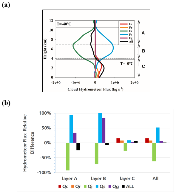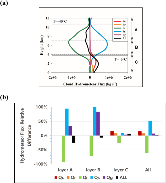 Within the temperature range from 0 to −40°, the total horizontal hydrometeor flux decreases by about 11 %, primarily due to a substantial reduction in cloud ice flux, accompanied by increases in snow and graupel fluxes. In Layer A, the total hydrometeor flux is about kg s−1, corresponding to about 75 % of T_CTL. Cloud ice flux drops sharply to about 8 % of T_CTL, while snow and graupel fluxes increase markedly to about 19.8 times and 7.8 times, respectively. In Layer B, the total hydrometeor flux is about kg s−1, corresponding to about 93 % of T_CTL, with cloud ice flux reduced to about 28 % of T_CTL, and snow and graupel fluxes increased to about 2.3 times and about 1.8 times, respectively. At temperatures above 0°, the total horizontal hydrometeor flux increases to about 106 % of T_CTL, with cloud water and rainwater fluxes increasing to about 115 % and about 108 %, respectively.