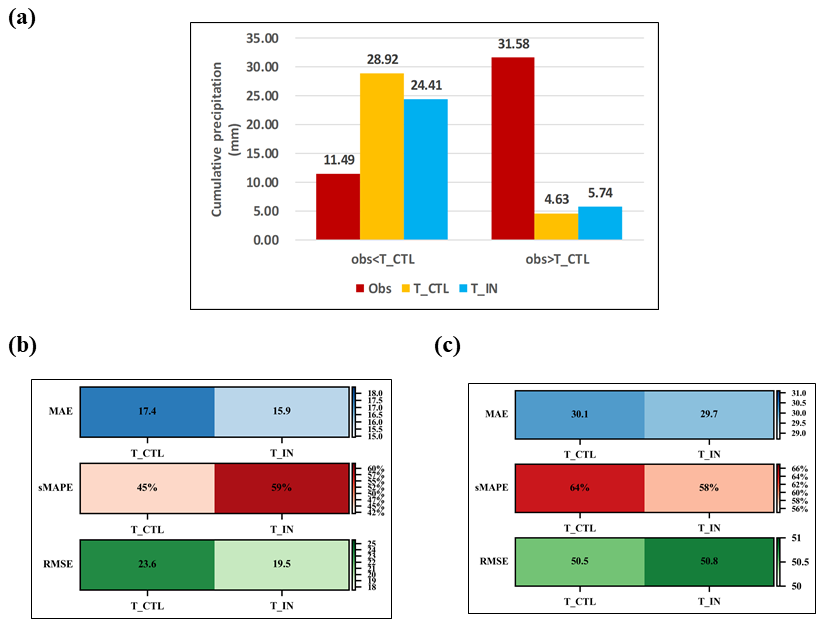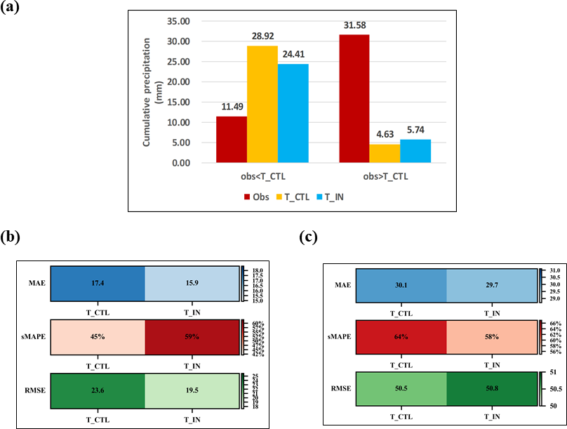 Finally, for underestimation stations, the mean accumulated precipitation increases by 1.1 mm compared to T_CTL, and precipitation simulation improves by approximately 4 %, with little changes in MAE and RMSE (Fig. 8b). For overestimated stations, the mean accumulated precipitation decreases by 4.5 mm compared to T_CTL, and precipitation simulations improves by approximately 40 %, with MAE reduced by 1.4 and RMSE reduced by 4.1 (Fig. 8a).