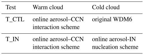 As shown in Table 1, two tests are designed. The first test uses the online aerosol–CCN–cloud interaction scheme from Zhou et al. (2016), denoted as T_CTL. Based on T_CTL, the second test adds the online aerosol-IN nucleation scheme described in Sect. 2.3, denoted as T_IN.