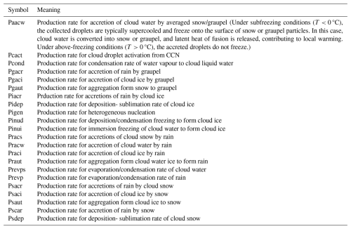 In this study, we select the WDM6 microphysics scheme in GRAPES to simulate precipitation (Hong et al., 2004; Zhang et al., 2022). The WDM6 scheme simulates the mass mixing ratio of water vapour (Qv), as well as the mass and number concentrations of cloud water (Qc) and rainwater (Qr) in warm clouds. For icy clouds, it includes the mass mixing ratios of cloud ice (Qi), snow (Qs), and graupel (Qg). A double-moment cloud ice scheme by Park and Lim (2023) is incorporated into the WDM6 scheme, enabling explicit prediction of cloud ice number concentration. A sectional CCN-activated scheme has been introduced in WDM6 in GRAPES/CUACE, connecting the multi-component, multi-section aerosols from CUACE to the WDM6 microphysics and the sub-grid convective parameterisation scheme via newly activated CCN at each time step (Zhou et al., 2016).