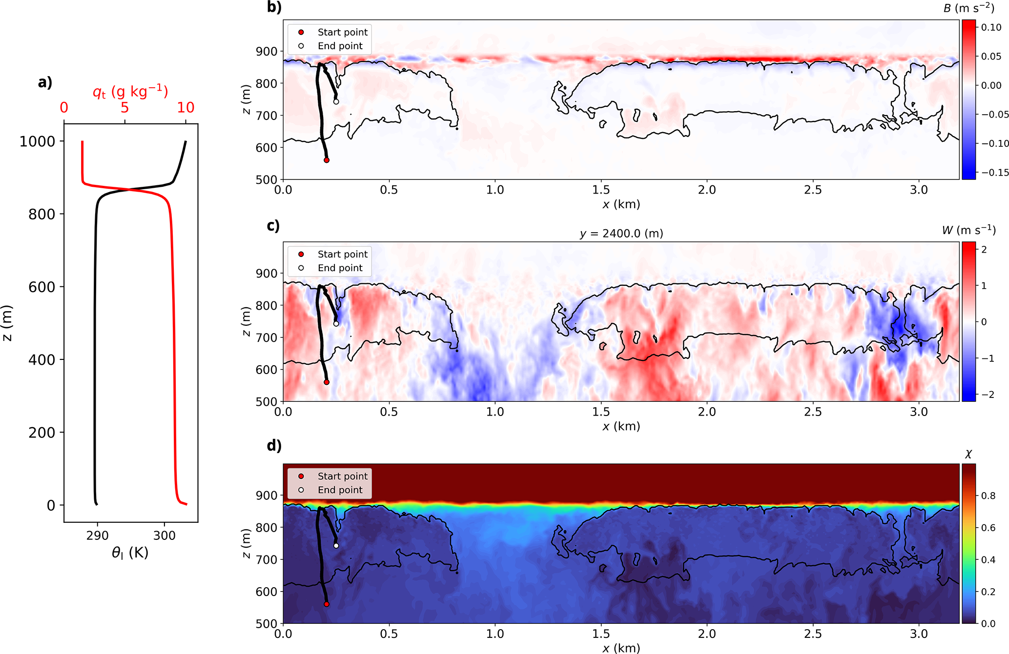 Figure 1(a) Vertical profiles of qt (red solid line) and θl (black solid line). Vertical cross-sections of (b) buoyancy B, (c) vertical velocity W, and (d) mixing fraction χ at y=2400 m, presented as a snapshot at a simulation time of t=13 320 s. In panels (b–d), the Lagrangian trajectory of a selected particle is overlaid as a thick black line, tracing its path from the entry point (red dot at t=12 298.5s) to its current position (white dot at t=13 320s). The thin black solid lines indicate where the cloud water mixing ratio qc=0.01gkg-1.