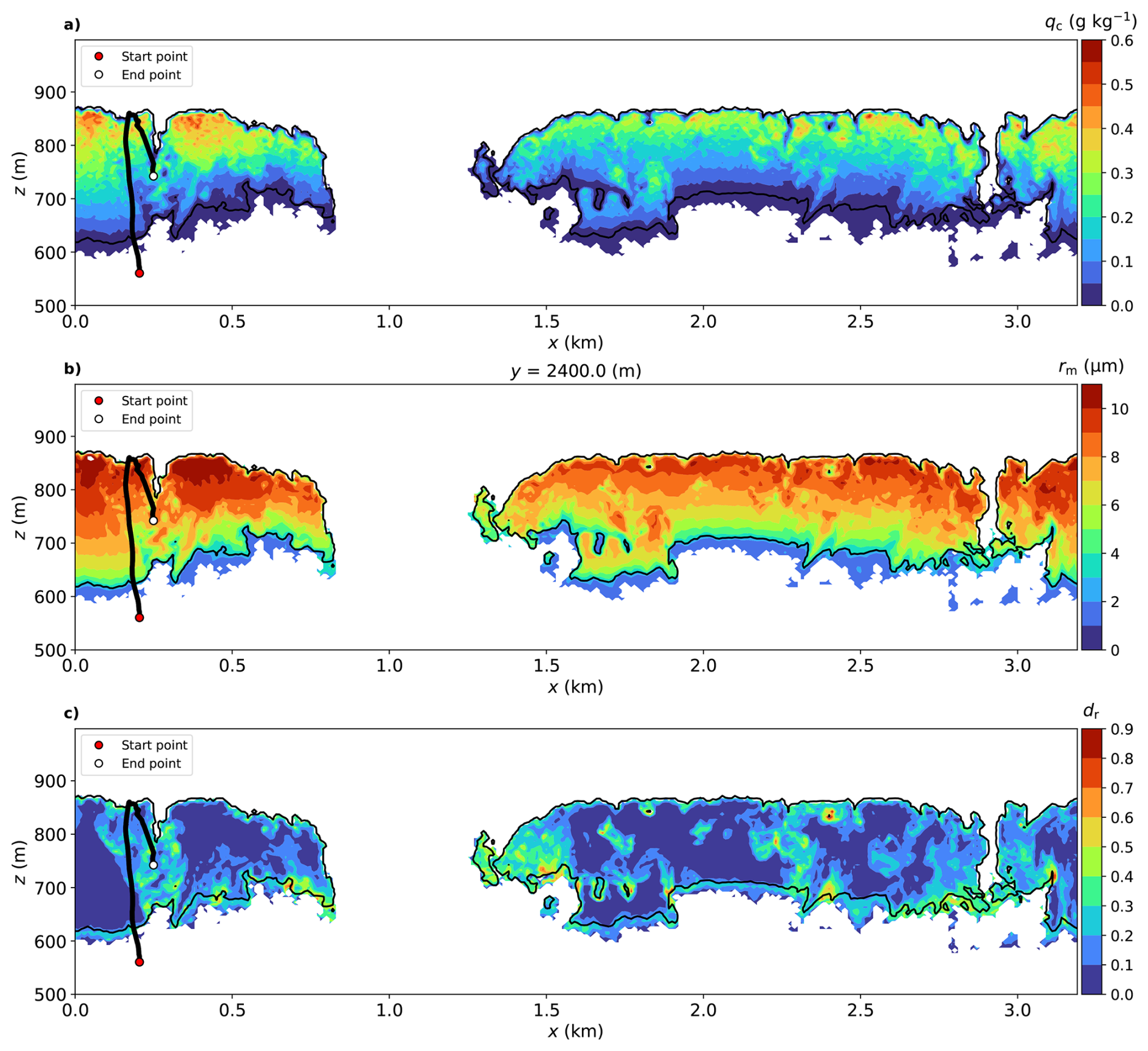 Figure 3Vertical cross-sections of (a) qc, (b) rm, and (c) dr at y=2400 m, presented as a snapshot at a simulation time of t=13 320 s. The thick black line traces the Lagrangian history of a selected droplet, ending at its current position (white dot) at this instant and extending backward in time to its cloud entry point (red dot). The thin black lines in each panel indicate the cloud boundary defined by a mixing ratio of qc=0.01gkg-1.