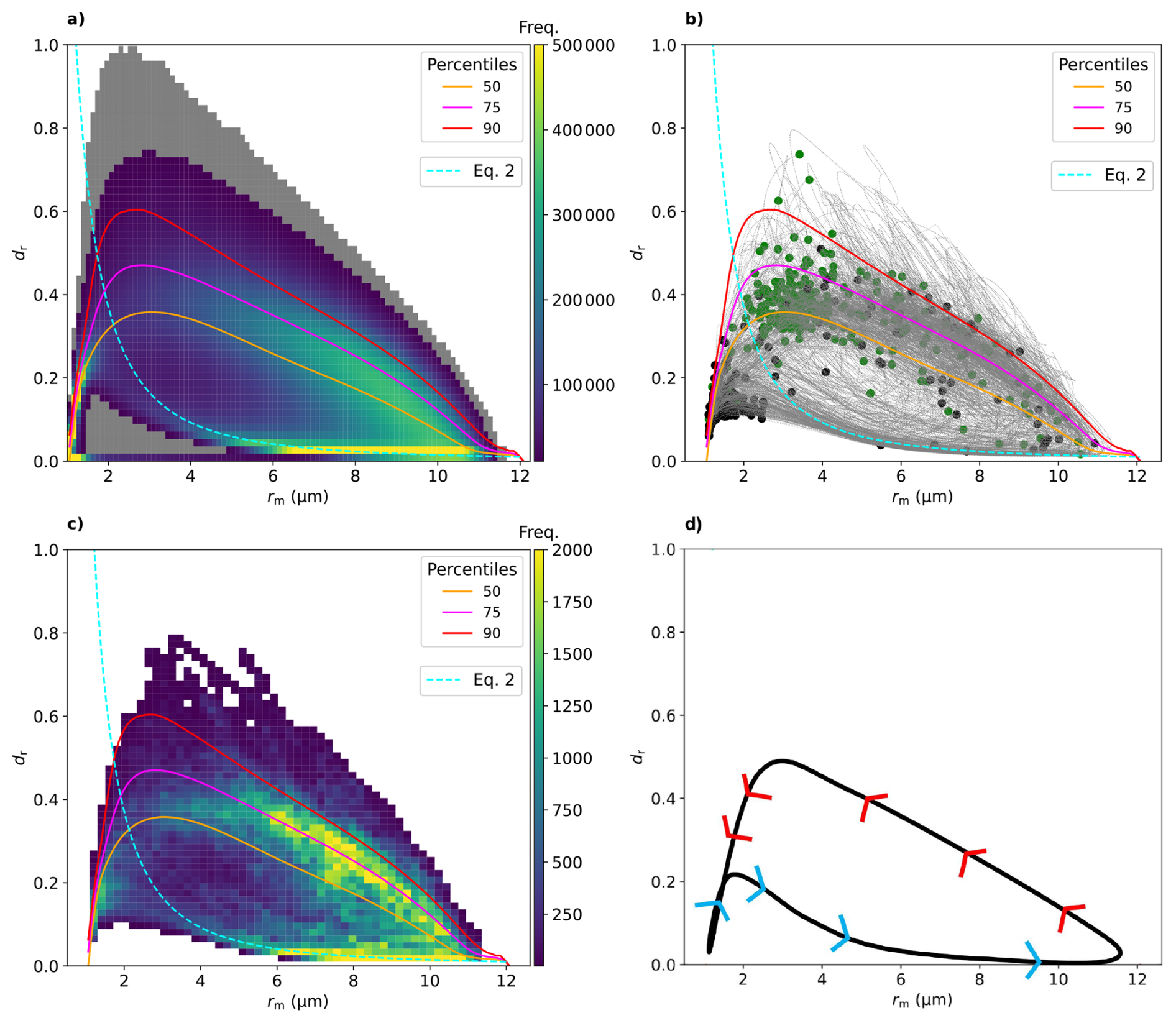 While Eq. (5) effectively captures the growth pathway, it fails to describe the evaporation pathway (Fig. A1). To approximate the latter, we utilize percentile-based diagnostics, where the 50th, 75th, and 90th percentiles of dr at each rm bin provide a reasonable empirical representation of the evaporation pathway (Fig. 4a–c), exhibiting an inverse trend between dr and rm. In analogy to Eq. (5), the fitted function is given as