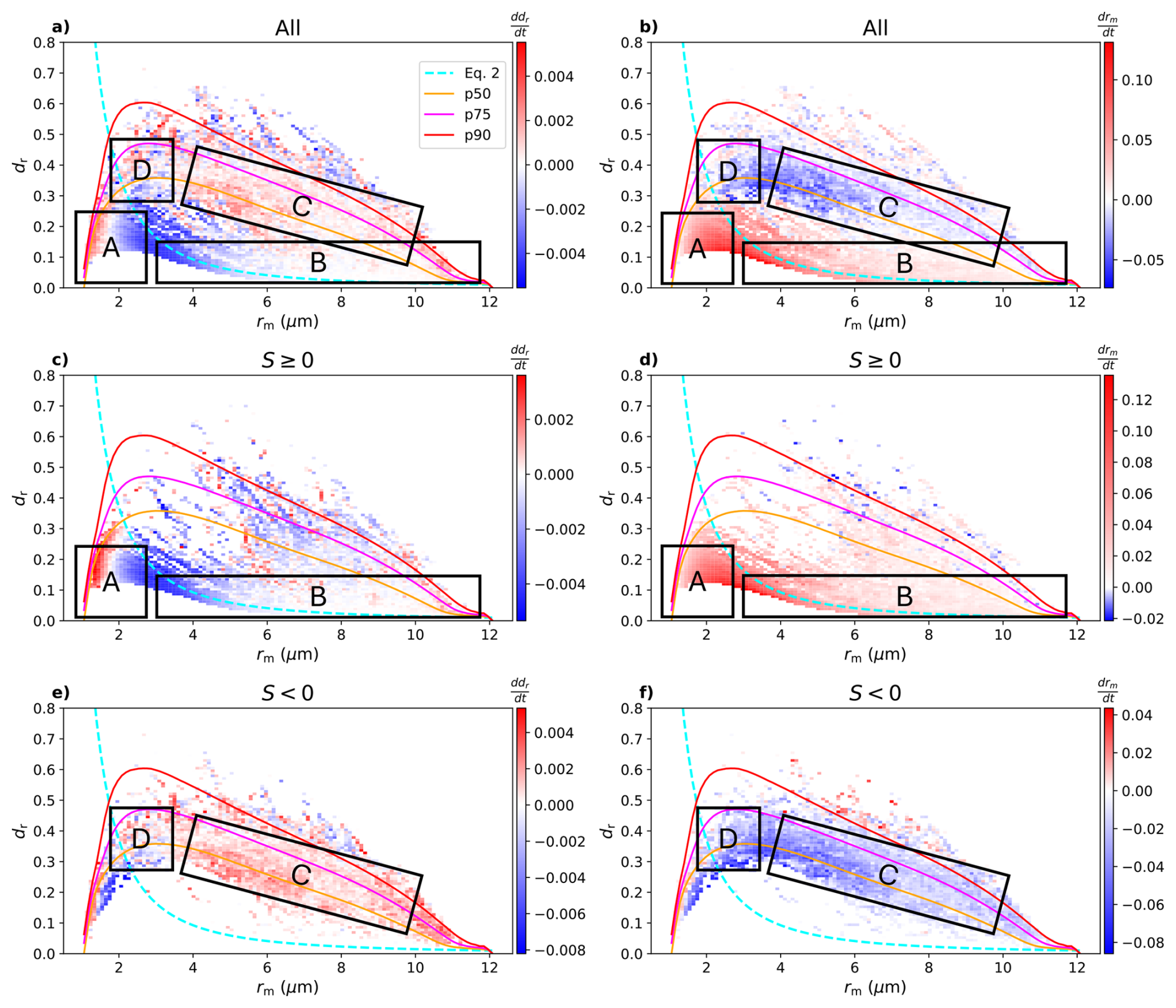 Figure 5Two-dimensional binned mean values of the rates of change, ddr/dt (first column) and drm/dt (second column), in the rmdr phase space for all conditions (first row), S≥0 (second row), and S<0 (third row). In each panel, the 50th, 75th, and 90th percentile values (p50, p75, p90), and Eq. (5) from Fig. 4 are indicated by solid lines in orange, magenta, red, and cyan, respectively. Each panel shows 2D binned mean values of ddr/dt and drm/dt in the rmdr phase space, based on Lagrangian trajectories smoothed with a Gaussian kernel (window =10s) and averaged over time.