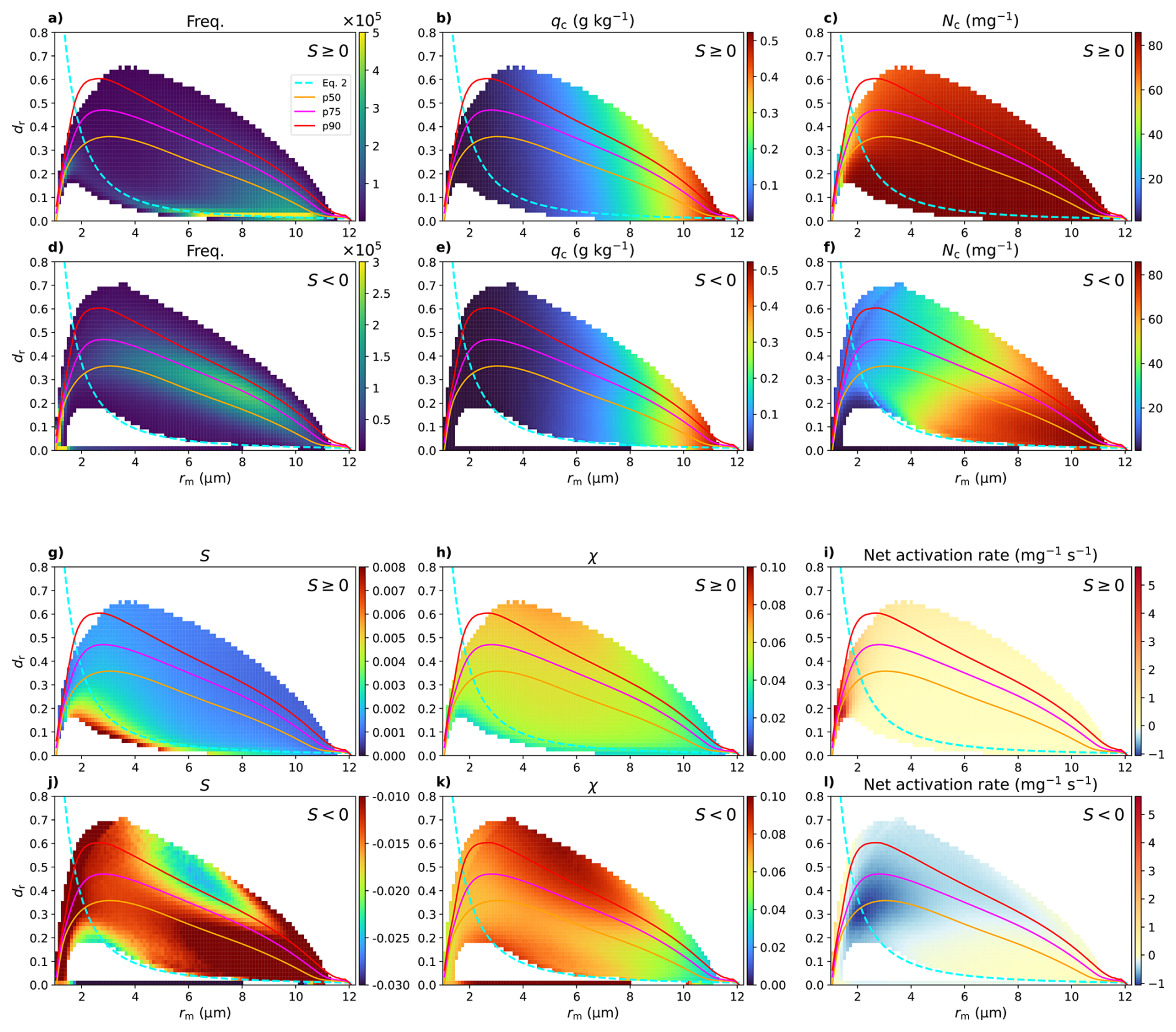 Figure 6Two-dimensional binned mean values of cloud properties in the rm and dr phase space for S≥0 (first and third row) and S<0 (second and fourth row). (a) and (d) show the frequency distributions, (b) and (e) show cloud water mixing ratio (qc), (c) and (f) show cloud droplet number concentration (Nc), (g) and (j) show the mean supersaturation (S), (h) and (k) show mixing fraction (χ) and (i) and (l) show net activation rate (activation rate – deactivation rate). In each panel, the 50th, 75th, and 90th percentile values (p50, p75, p90), and Eq. (5) from Fig. 4 are indicated by solid lines in orange, magenta, red, and cyan, respectively. Values represent bin-averaged means from 3D simulation results during the final 2 h of simulation, mapped onto the rmdr phase space.