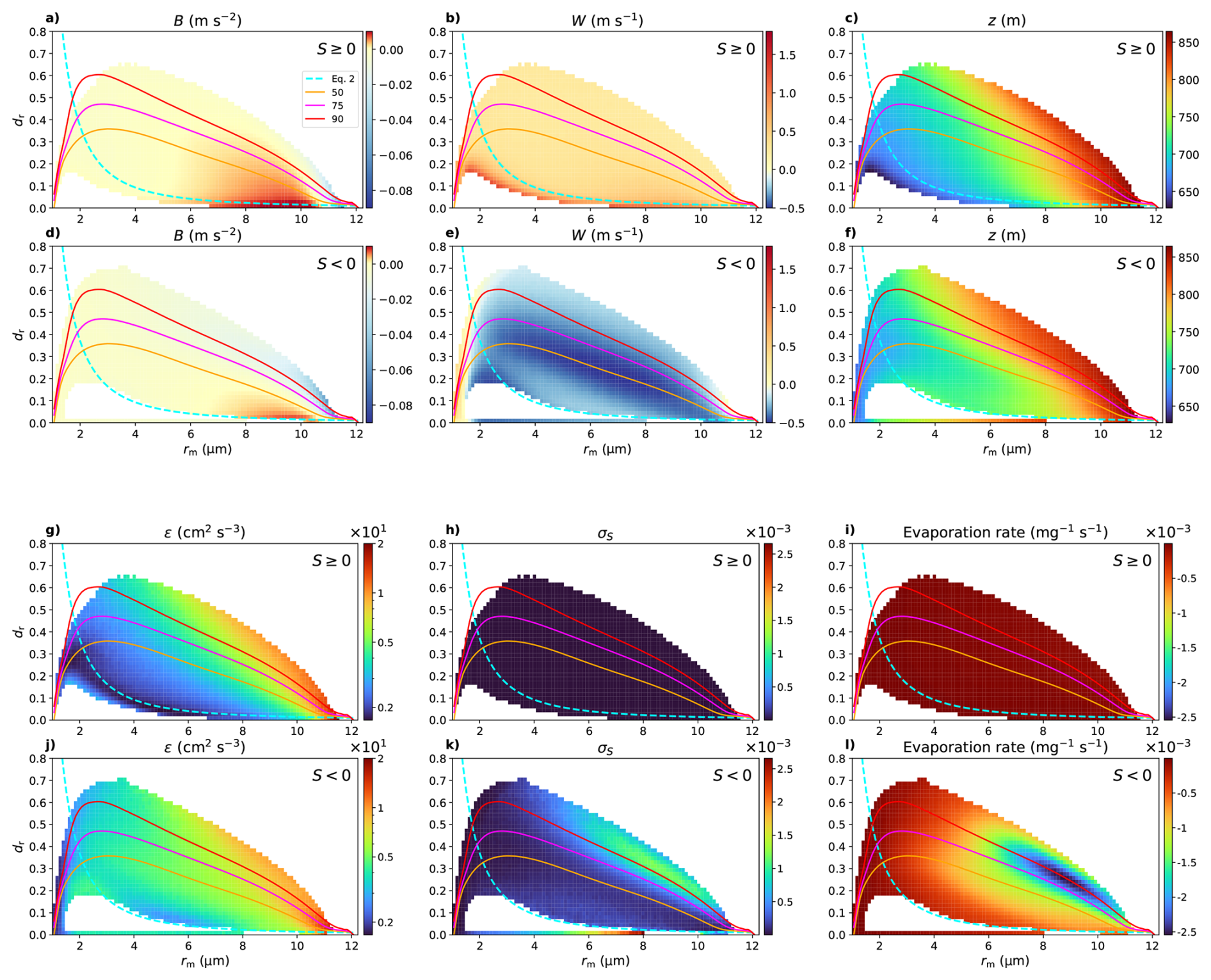 Figure 7Two-dimensional binned mean values of cloud properties in the rm and dr phase space for S≥0 (first and third row) and S<0 (second and fourth row). (a) and (d) show buoyancy (B), (b) and (e) show vertical velocity (W), (c) and (f) show height (z), (g) and (j) show kinetic dissipation rate (ε), (h) and (k) show supersaturation fluctuation (σS) and (i) and (l) show the evaporation rate. In each panel, the 50th, 75th, and 90th percentile values (p50, p75, p90), and Eq. (5) from Fig. 4 are indicated by solid lines in orange, magenta, red, and cyan, respectively. Values represent bin-averaged means from 3D simulation results during the final 2 h of simulation, mapped onto the rmdr phase space.