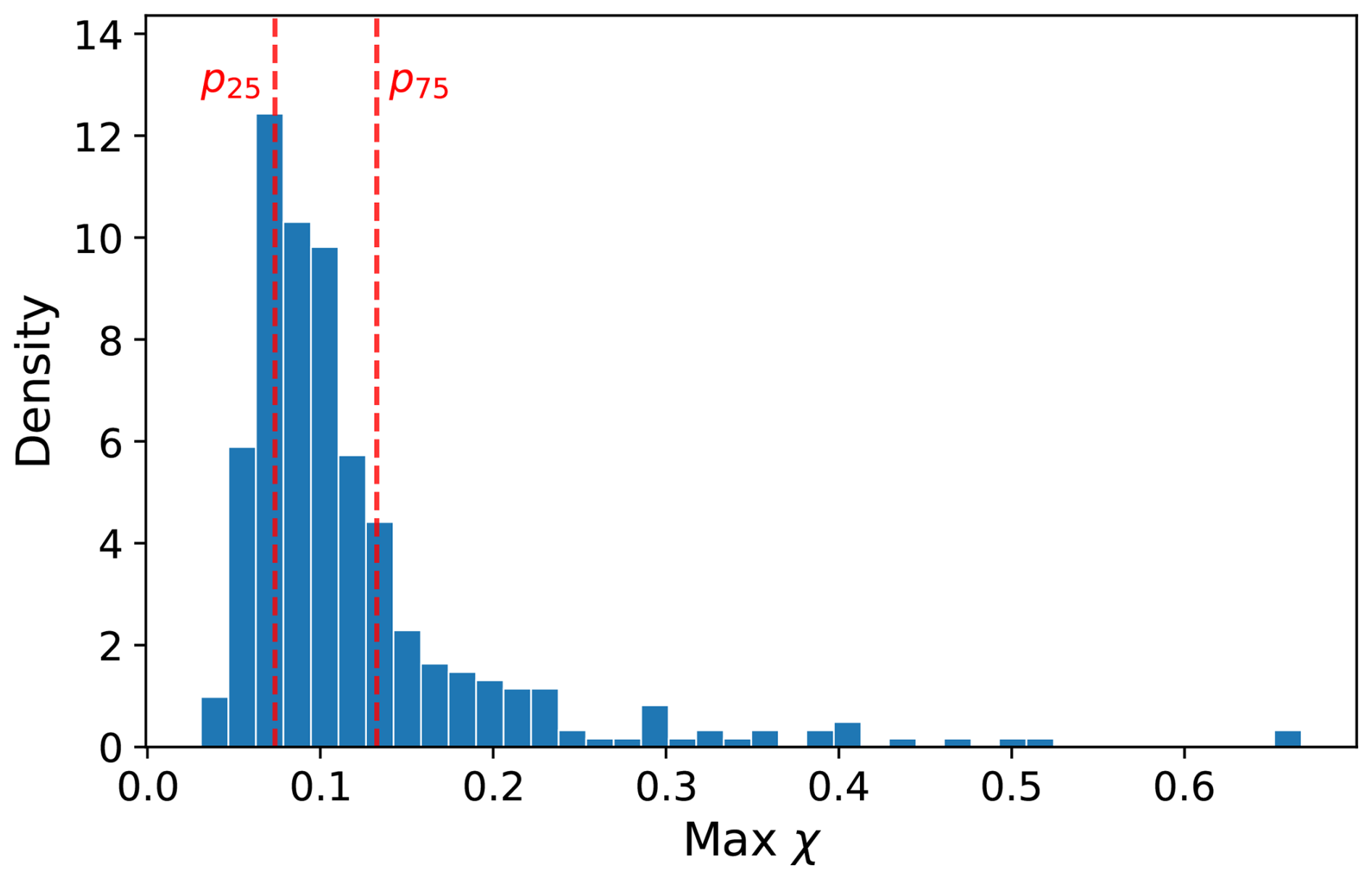 Figure 8Density distribution of maximum χ for individual tracked particles over their lifetime in the stratocumulus-topped boundary layer. The 25th (p25) and 75th (p75) percentiles of the maximum χ are indicated with red dashed lines.