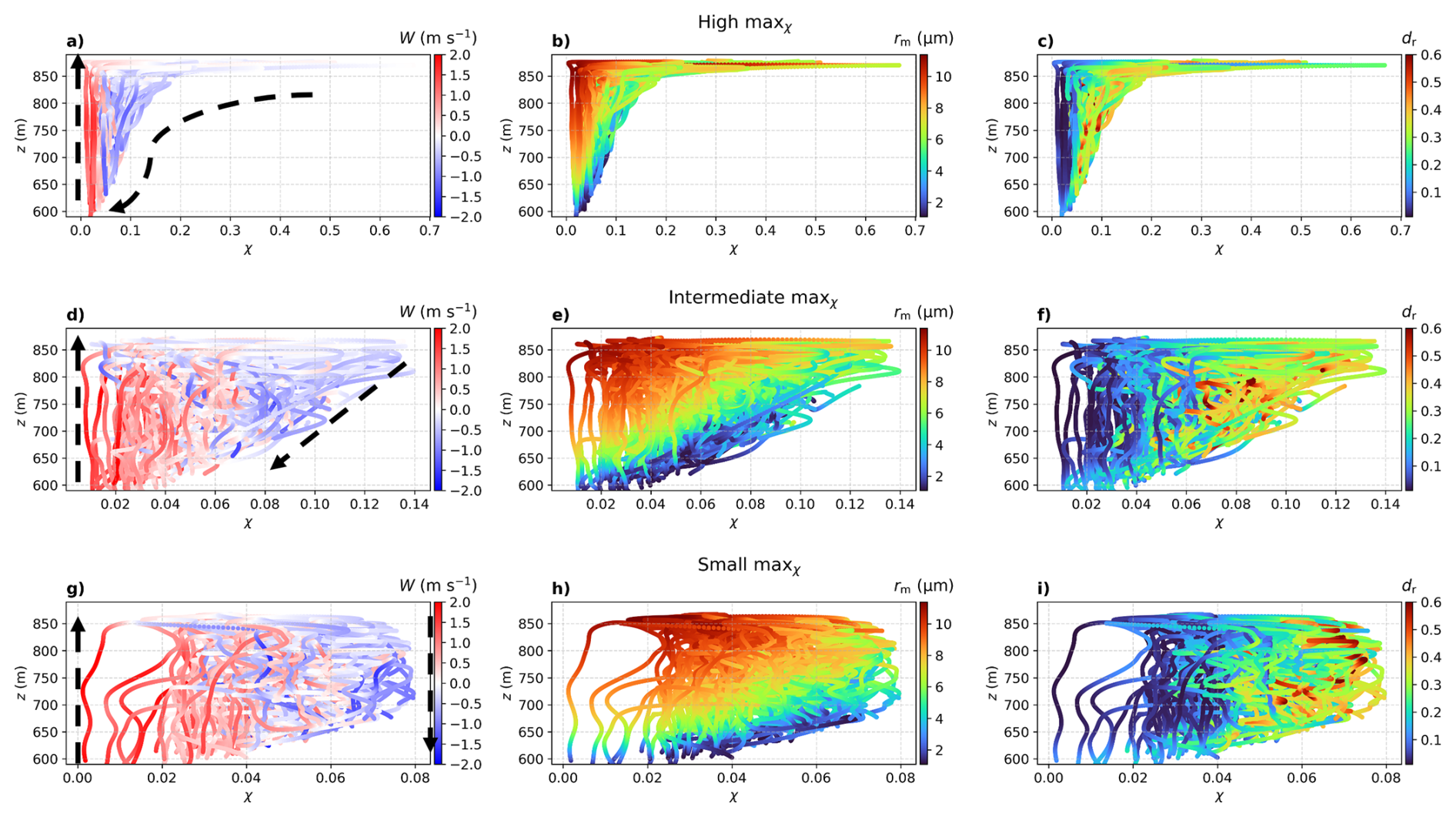 Figure 9Particle trajectories in the χz phase space, where different colors of dots indicate: the W (first column), rm (second column), dr (third column). The first row shows trajectories with the maximum χ>0.14, the third row shows trajectories where the maximum χ≤0.08, and the second row shows trajectories with intermediate values, where the maximum χ lies between these two conditions. In panels (a)(d), and (g), the dashed black arrows indicate inferred droplet motion directions based on the vertical velocity W.