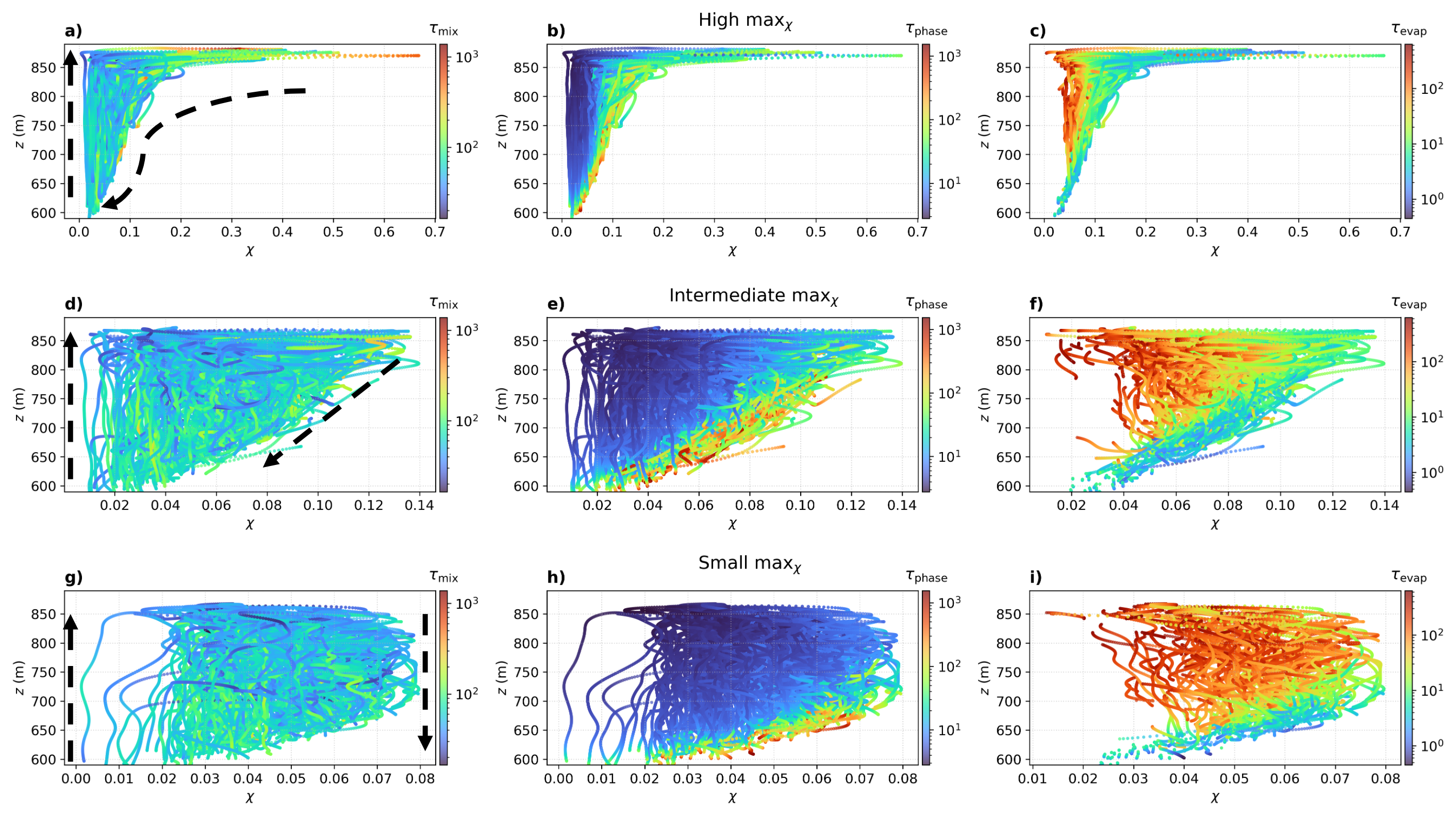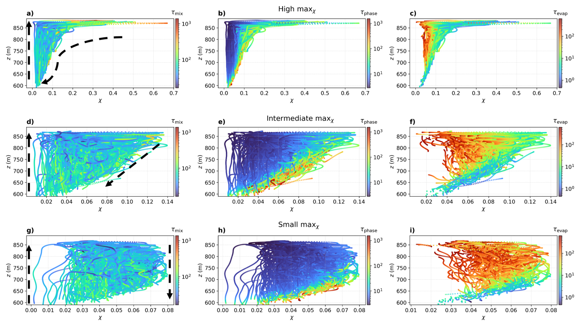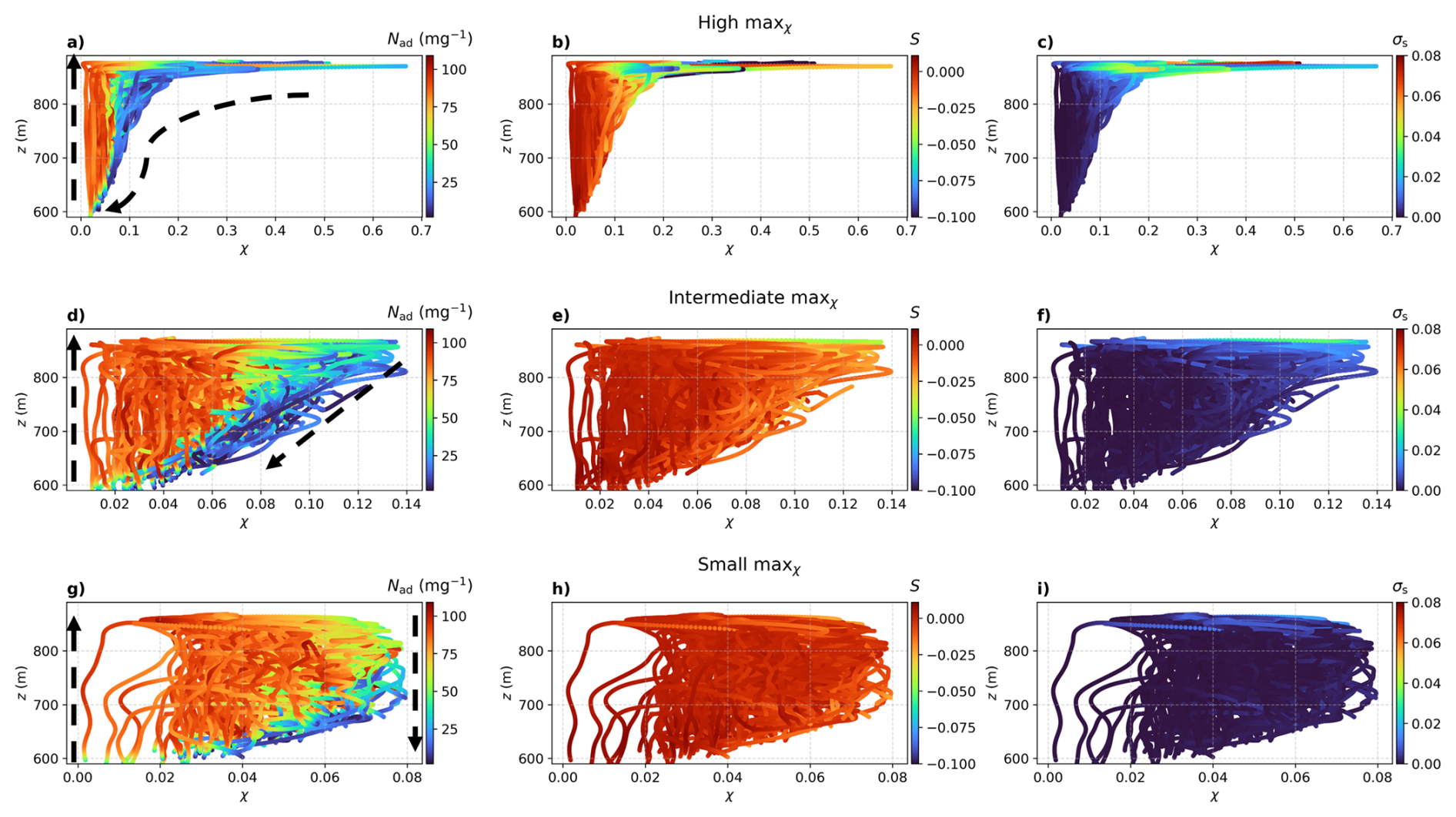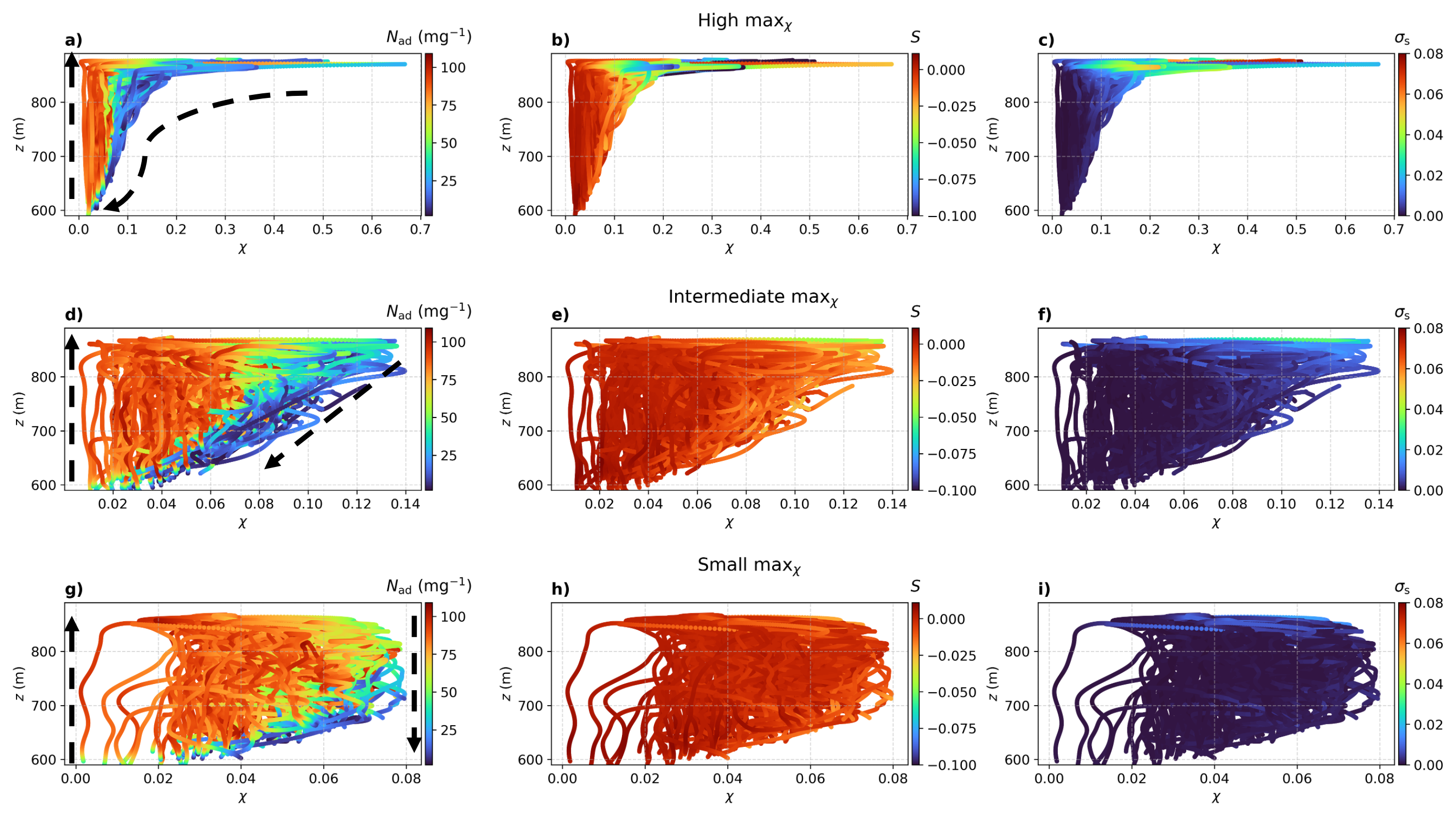 Figure 10Particle trajectories in the χz phase space, where different colors of dots indicate: the Nad (first column), S (second column), and σS (third column). The first row shows trajectories with the maximum χ>0.14, the third row shows trajectories where the maximum χ≤0.08, and the second row shows trajectories with intermediate values, where the maximum χ lies between these two conditions. In panels (a)(d), and (g), the dashed black arrows indicate inferred droplet motion directions based on the vertical velocity W.