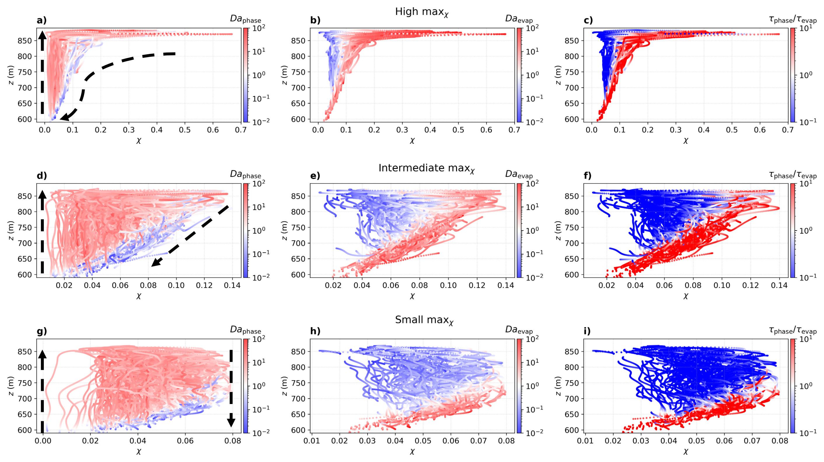 To resolve this ambiguity, the maps of Daphase, Daevap, and the ratio τphase/τevap in the χz phase space (Fig. 11) quantify the varying inhomogeneous and homogeneous mixing signals at the same height. Here, the Damköhler number is defined generally as