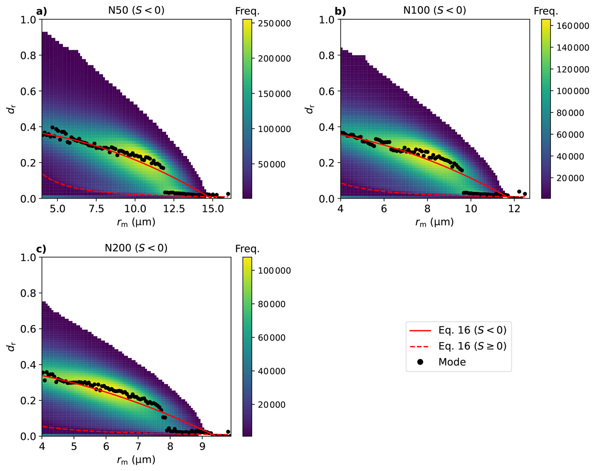 Figure 13Frequency distribution in the rmdr phase space for S<0 for the (a) N50, (b) N100, and (c) N200 cases. Black dots represent the most frequent value (mode) in each rm bin. The light-gray dashed line shows the fit of the analytical growth-phase equation (Eq. 5) to the S<0 data. The red lines represent the empirical fits for this evaporation pathway using the final quadratic formulation (the S<0 part of Eq. 16 as solid and the S≥0 part of Eq. 16 as dashed). All fits are based on the median dr value in each rm bin.