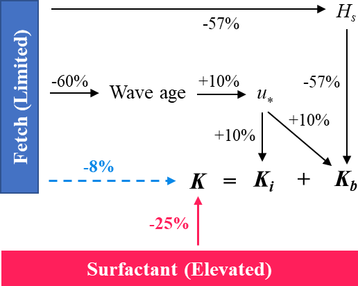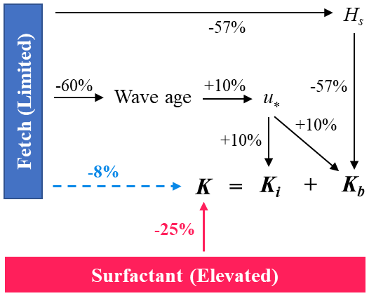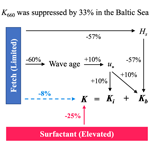 Figure 8Schematic illustrating how fetch and surfactants modulate the CO2 transfer velocity (K) in the Baltic Sea relative to the open ocean. Values denote the relative magnitude of enhancement (+) or suppression () for each process (Table 1). Black arrows and their associated values indicate the effect of fetch on individual gas exchange components, while the blue value on the dashed arrow shows the net fetch effect on total K. The red value and arrow represent the constrained surfactant-induced suppression of K.