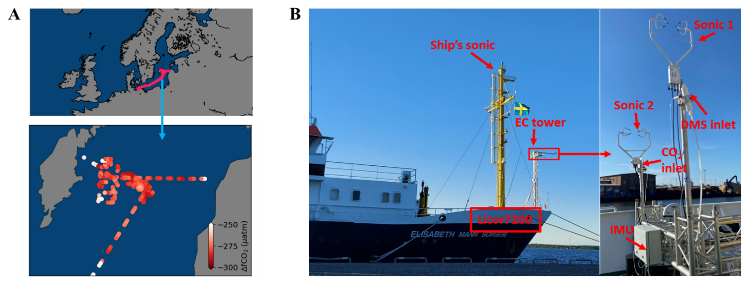 Figure 1CenBASE cruise tracks and the ship-based eddy covariance (EC) system. Left panel: Cruise tracks in the central Baltic Sea, color-coded by air–sea CO2 fugacity differences (ΔfCO2). Middle panel: Research vessel EMB during the CenBASE cruise; a custom-built EC tower is mounted at the bow. Right panel: Instruments mounted on top of the tower, including sonic anemometers, a motion sensor (IMU), and the CO2 inlet. Additional setup details are provided in Sect. 2.