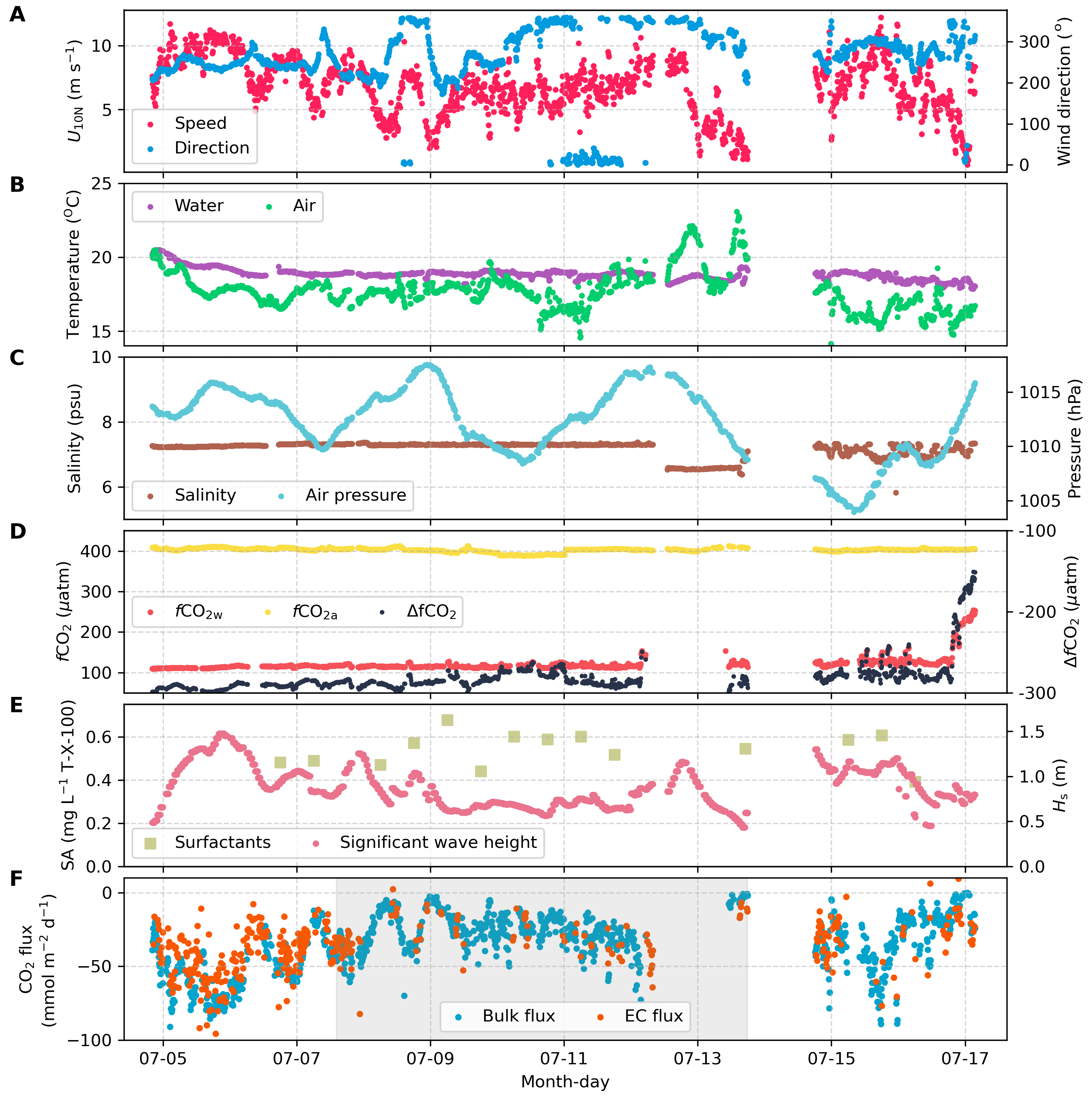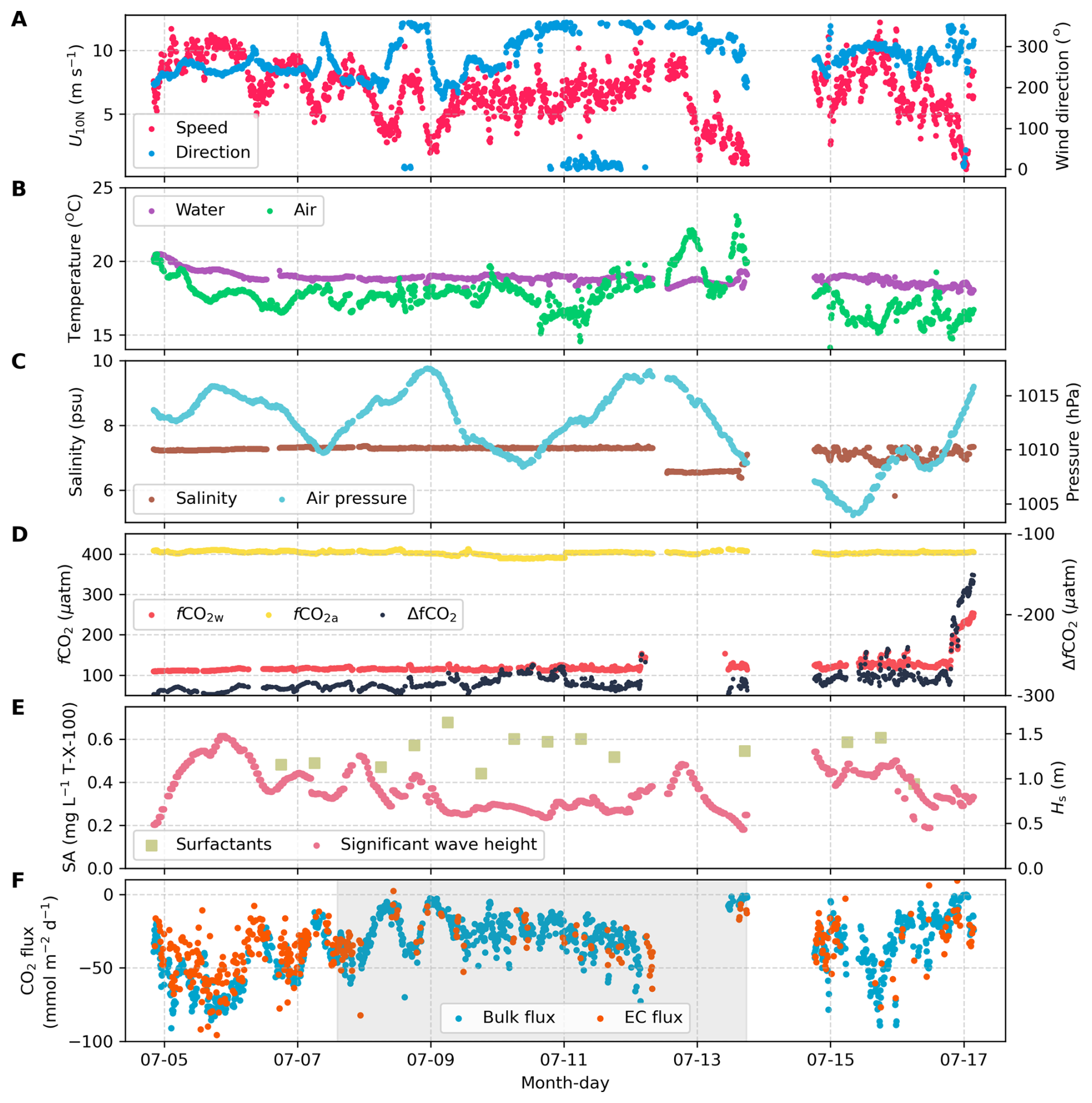 Figure 2Ten min averages of environmental variables and air–sea CO2 flux. (A) Neutral 10 m wind speed (U10N, red) and wind direction (blue). (B) Surface seawater temperature (purple) and air temperature (green). (C) Seawater salinity (brown) and sea-level air pressure (light-blue). (D) CO2 fugacity in surface seawater (red) and atmosphere (yellow), and their difference (ΔfCO2, black). (E) Surface microlayer surfactant activity (SA, light green squares) and significant wave height extracted from ERA5 (Hs, red); (F) Bulk CO2 flux estimates (blue, based on K660 parameterisation from Ho et al., 2006) and EC CO2 flux observations (orange). The dual-tracer tracing period is indicated by the light gray shading. Data are missing from 12–14 July due to a medical event and a temporary shortage of liquid nitrogen, which required the vessel to leave the primary study area.