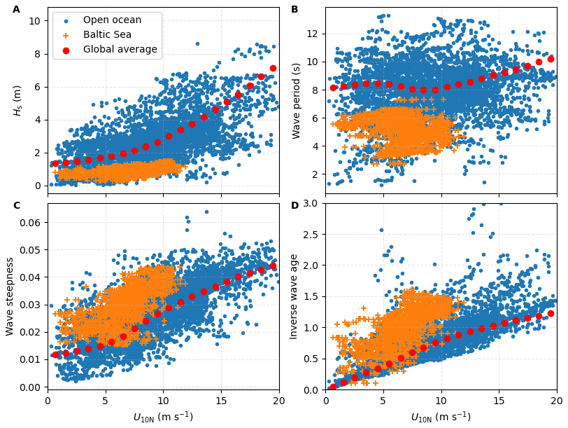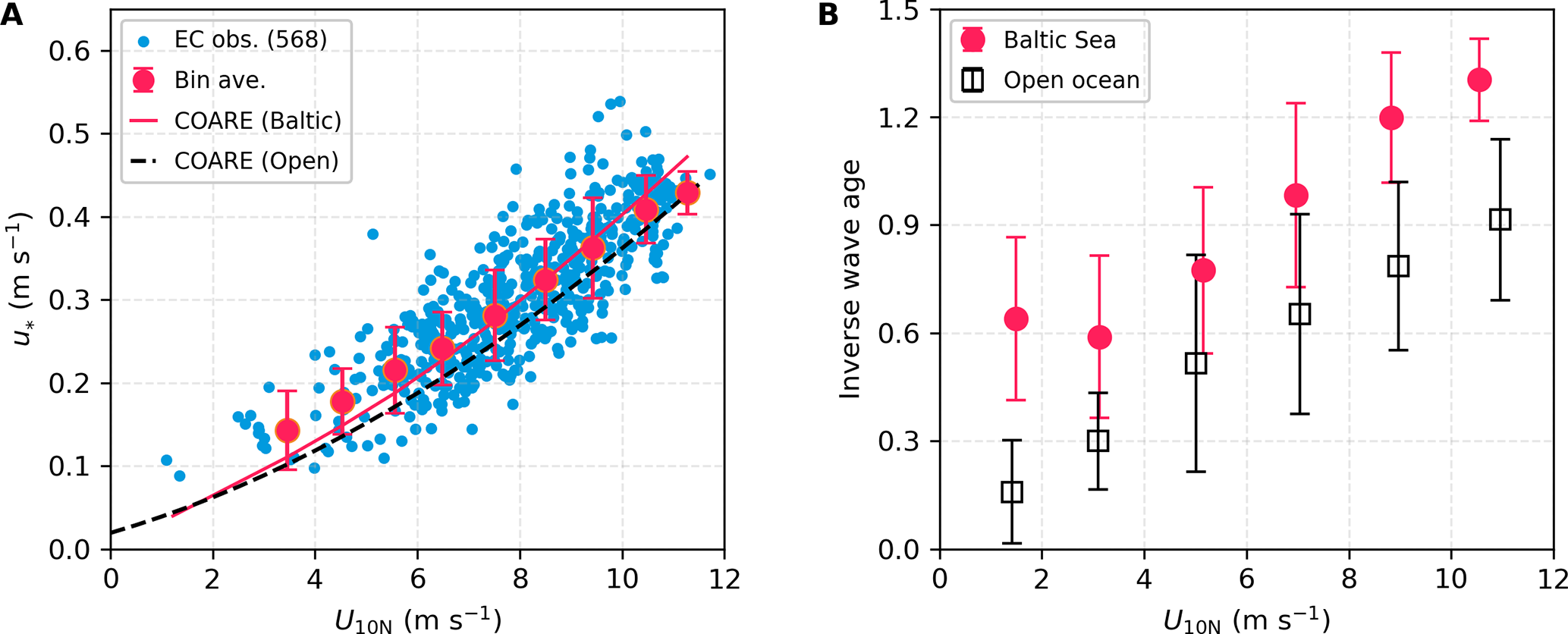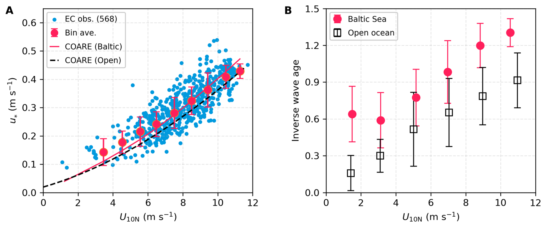 Figure 3Friction velocity (u) and inverse wave age in the Baltic Sea (CenBASE) and open ocean. (A) u derived from EC air–sea momentum fluxes versus 10 m neutral wind speed (U10N). Blue dots: 10 min u observations during CenBASE (568 points), with red points corresponding to bin averages (per 1 m s−1). Red line: u simulated by COARE3.6 using the Baltic Sea environmental data; Black-dashed line: COARE3.6 simulations in the open ocean. (B) Inverse wave age (U10N/Cp) in the Baltic Sea (red dots) and open ocean (black squares). Error bars denote ± 1 standard deviation (SD) of bin averages. The hourly wave parameters are shown in Fig. A2 of the Appendix.